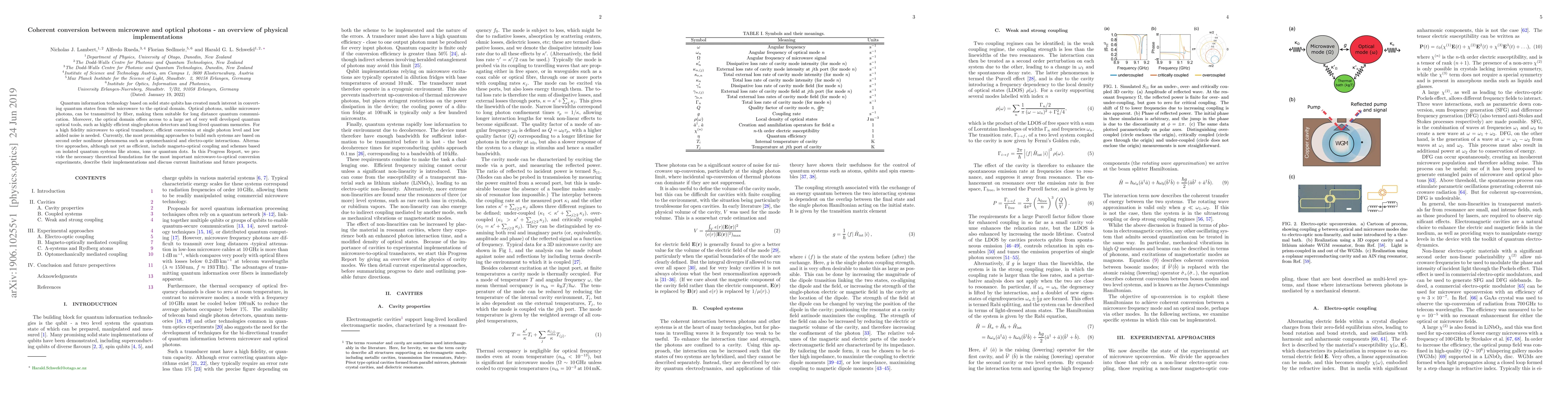 This paper reviews physical implementations for converting microwave quantum states to optical photons, emphasizing the importance of efficient single-photon conversion and low noise for quantum communication. The focus is on second-order nonlinear phenomena and alternative approaches like magneto-optical coupling and isolated quantum systems.