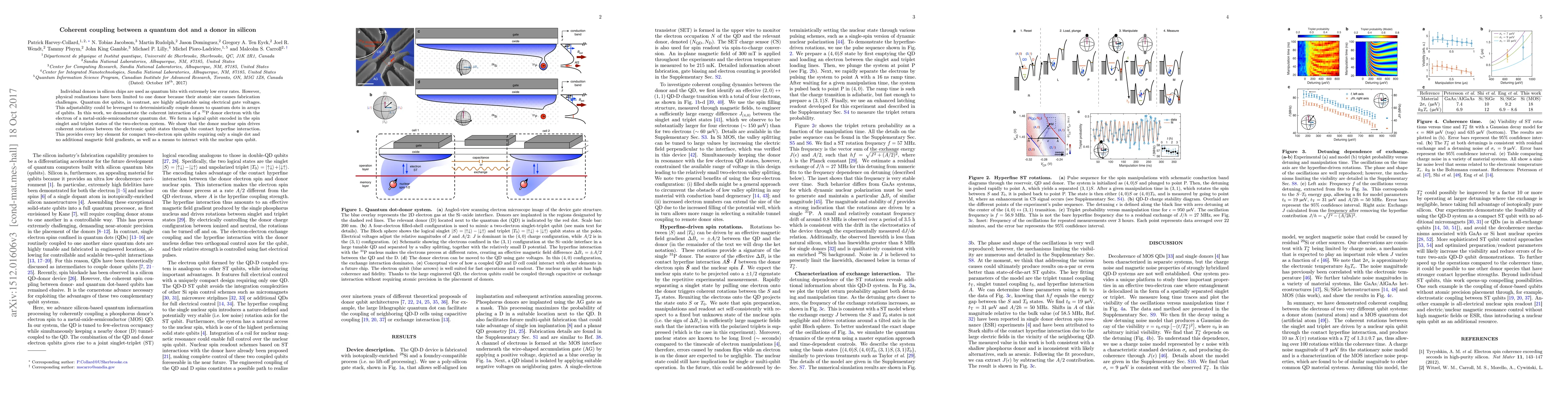 Individual donors in silicon chips are used as quantum bits with extremely low error rates. However, physical realizations have been limited to one donor because their atomic size causes fabrication challenges. Quantum dot qubits, in contrast, are highly adjustable using electrical gate voltages. This adjustability could be leveraged to deterministically couple donors to quantum dots in arrays of qubits. In this work, we demonstrate the coherent interaction of a $^{31}$P donor electron with the electron of a metal-oxide-semiconductor quantum dot. We form a logical qubit encoded in the spin singlet and triplet states of the two-electron system. We show that the donor nuclear spin drives coherent rotations between the electronic qubit states through the contact hyperfine interaction. This provides every key element for compact two-electron spin qubits requiring only a single dot and no additional magnetic field gradients, as well as a means to interact with the nuclear spin qubit.