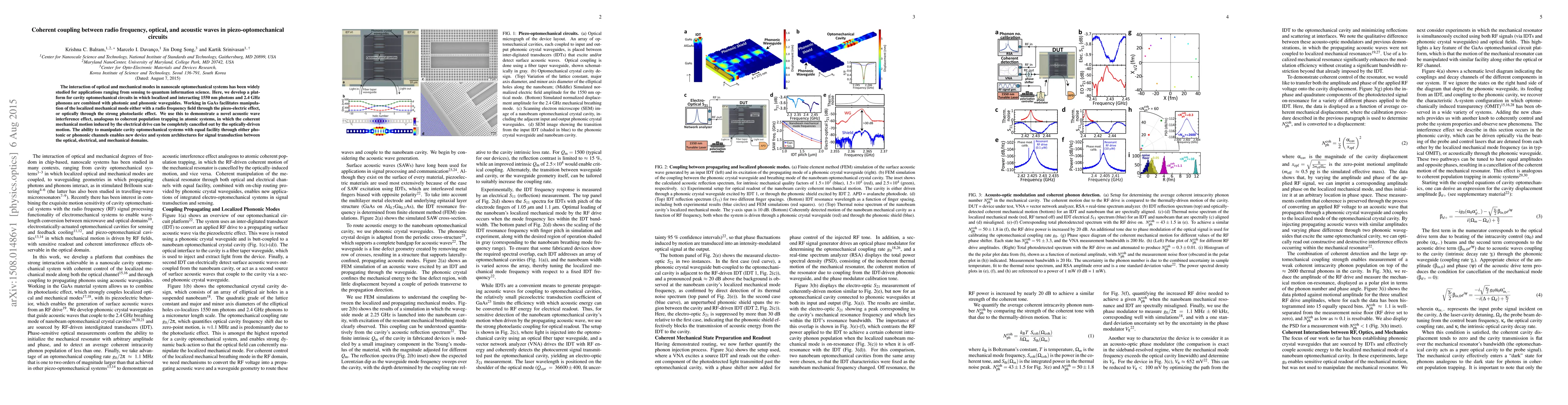 This paper presents a platform for cavity optomechanical circuits that coherently couple radio frequency, optical, and acoustic waves in piezo-optomechanical circuits. The study demonstrates a novel acoustic wave interference effect using GaAs, enabling new device architectures for signal transduction across optical, electrical, and mechanical domains.