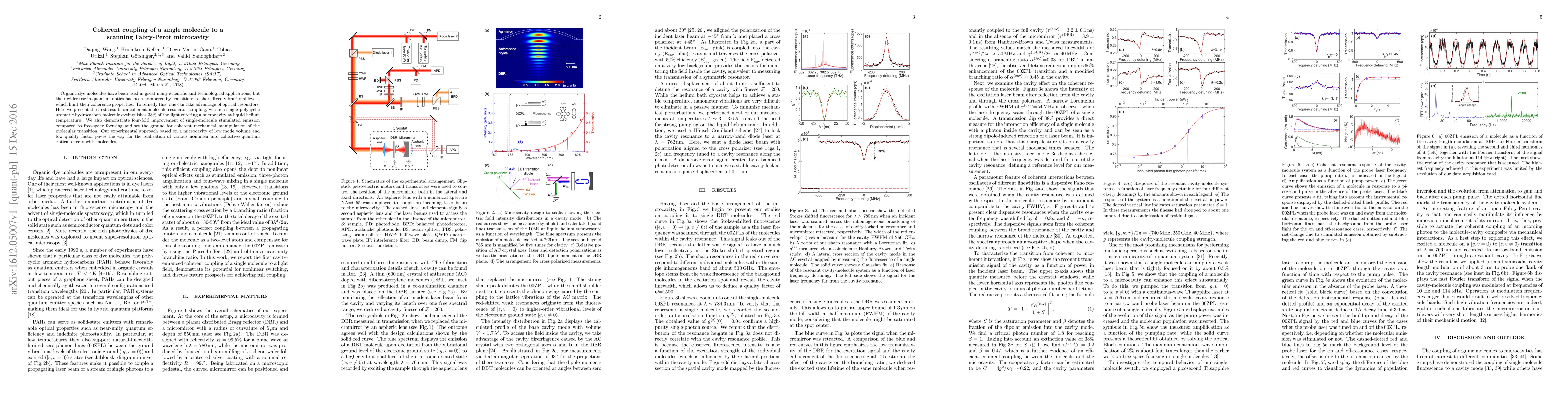 This paper reports the first coherent coupling of a single polycyclic aromatic hydrocarbon molecule to a scanning Fabry-Perot microcavity, achieving 38% light extinction and a four-fold enhancement in stimulated emission. The study lays the foundation for nonlinear quantum optical effects and molecular manipulation using optical resonators.