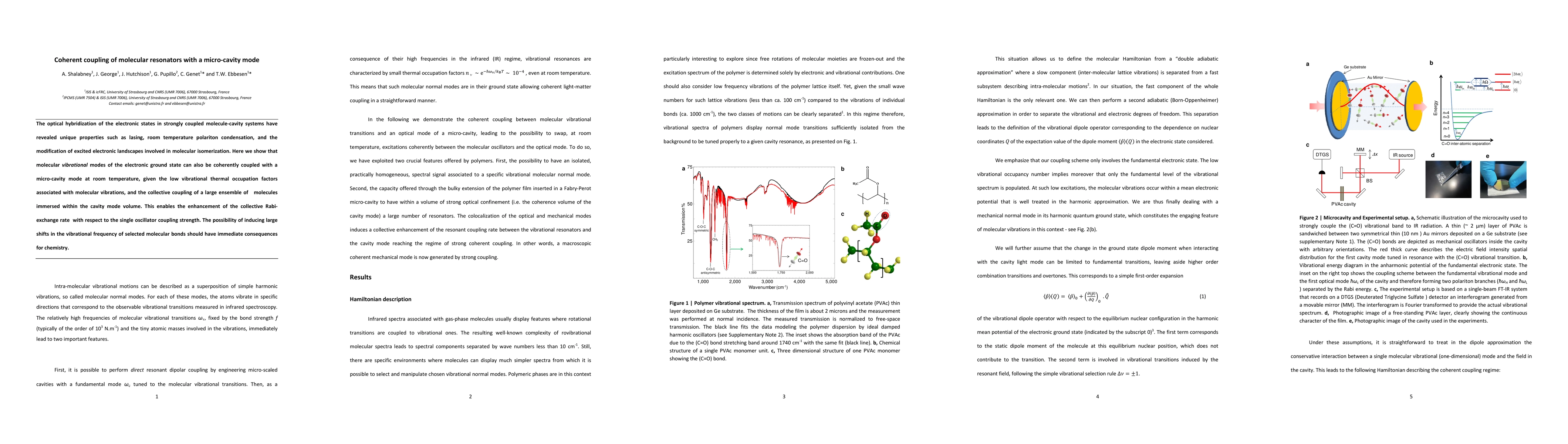 This paper demonstrates the coherent coupling of molecular vibrational modes with a micro-cavity mode at room temperature, enhancing the collective Rabi-exchange rate and enabling significant shifts in selected molecular bond frequencies, which has profound implications for chemical processes.