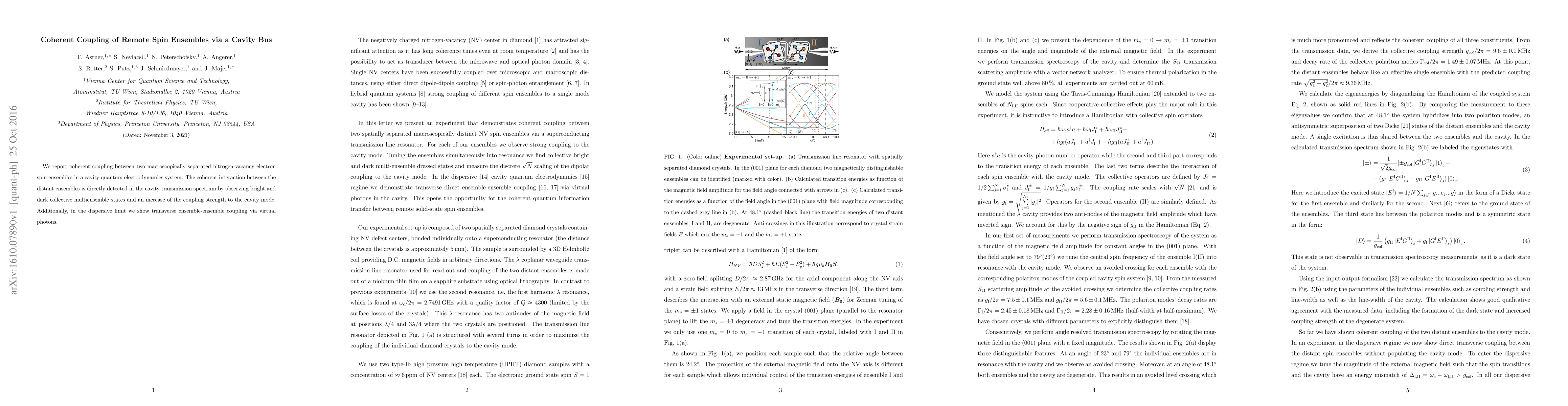 This paper demonstrates coherent coupling between two spatially separated nitrogen-vacancy spin ensembles using a cavity quantum electrodynamics system, showing increased coupling strength and observing collective multiensemble states in the cavity transmission spectrum. It also reveals transverse coupling via virtual photons in the dispersive limit.