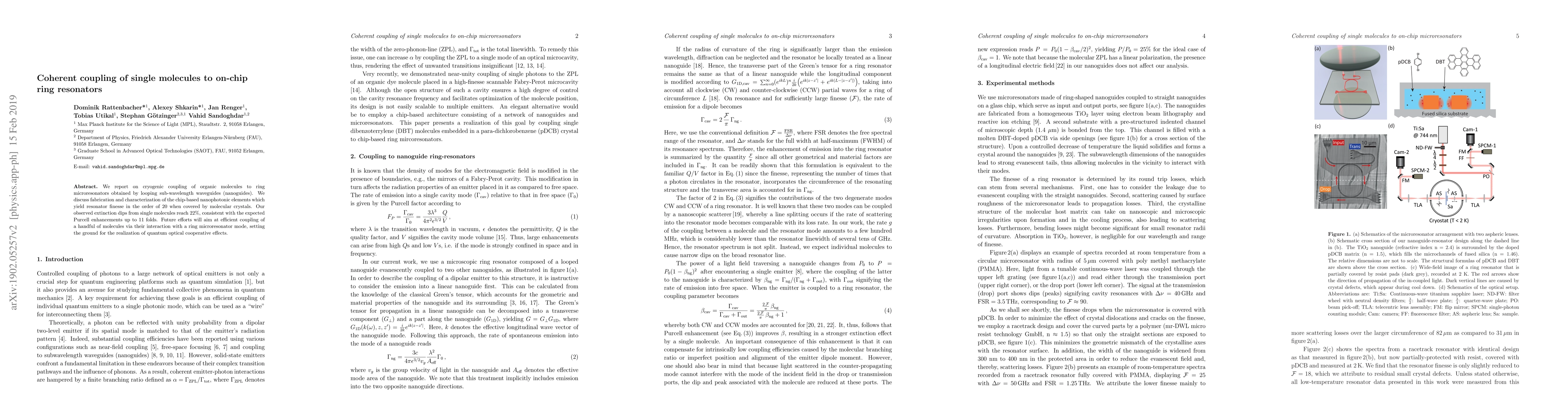 This paper details the cryogenic coupling of single organic molecules to on-chip ring microresonators, achieving high resonator finesse and significant Purcell enhancement. Future work aims to utilize this coupling for quantum optical cooperative effects.