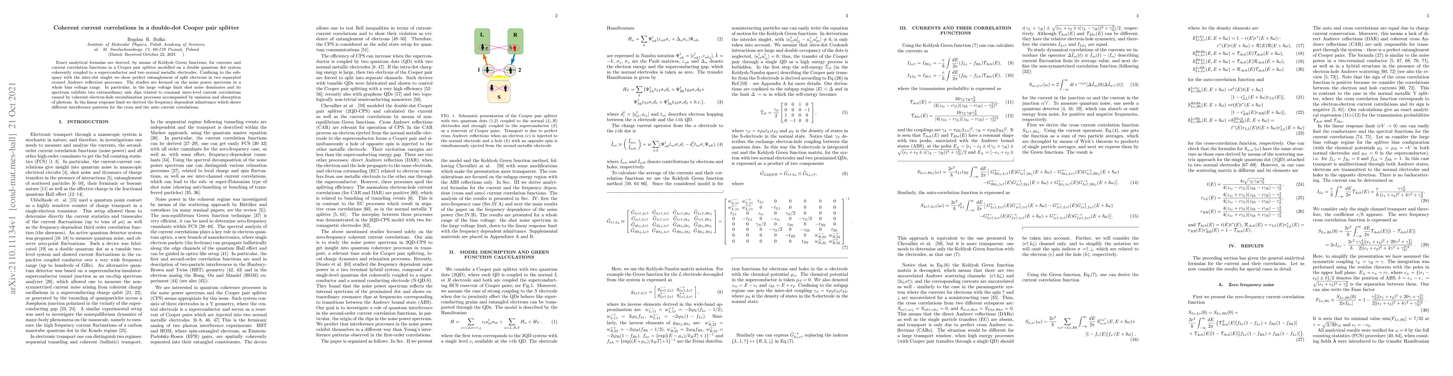 This paper derives exact analytical formulas for current and correlation functions in a double-dot Cooper pair splitter, showing perfect entanglement of split electrons. It highlights shot noise dominance at high voltages, revealing unique side dips in the noise spectrum due to coherent electron-hole recombination, and provides frequency-dependent admittance with distinct interference patterns for cross and auto current correlations.