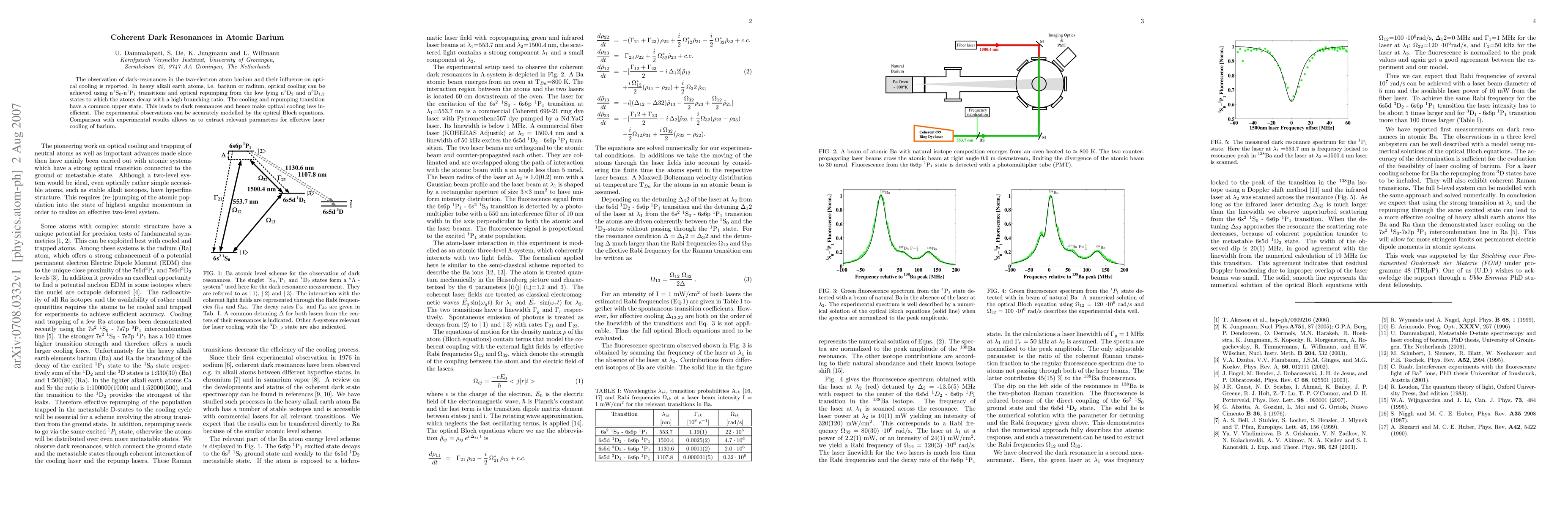 The paper reports the observation of dark resonances in atomic barium, affecting optical cooling due to common upper states in cooling and repumping transitions. These observations align with theoretical models using optical Bloch equations, aiding in extracting parameters for efficient barium laser cooling.