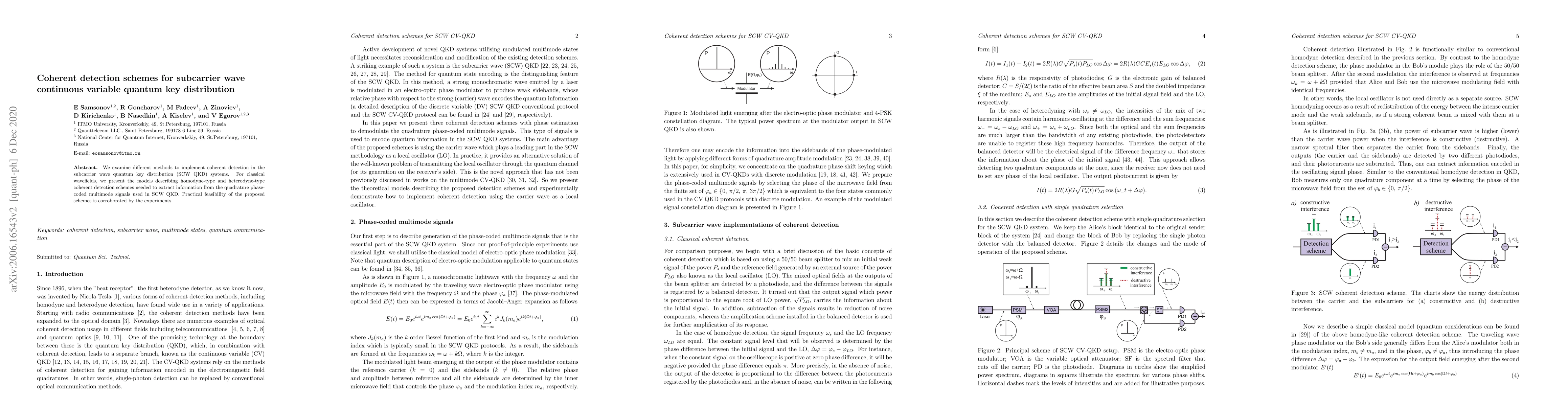 The paper explores coherent detection methods for subcarrier wave continuous variable quantum key distribution (SCW QKD), presenting homodyne-type and heterodyne-type models for classical wavefields. Experimental validation confirms the practical feasibility of these proposed schemes.