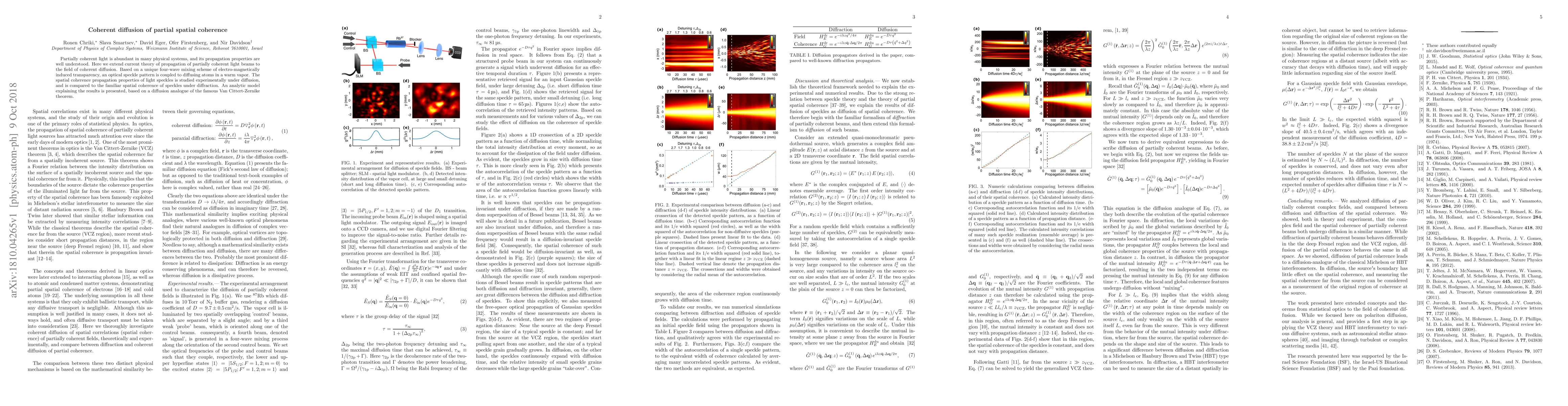 This paper explores the propagation of partially coherent light through diffusion, extending existing theory to coherent diffusion. An experimental setup using a four-wave mixing scheme in warm vapor demonstrates the spatial coherence properties of light speckles under diffusion, compared to diffraction, and an analytic model based on a diffusion analogue of the Van Cittert-Zernike theorem is proposed to explain the findings.
