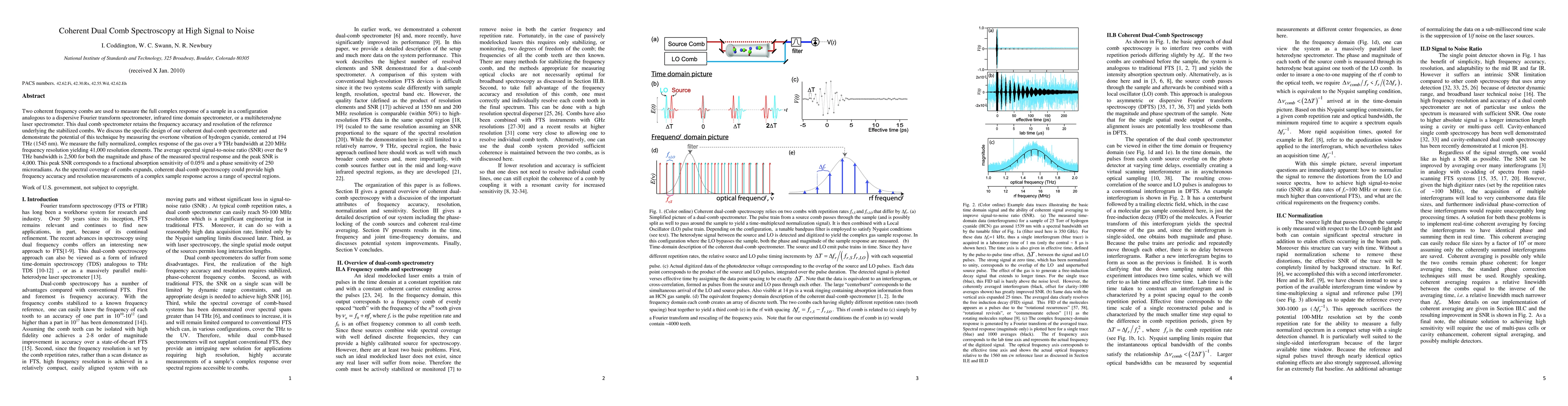 This paper describes a coherent dual-comb spectrometer that measures the full complex response of a sample with high signal-to-noise ratio, achieving an average SNR of 2,500, and demonstrating the technique by analyzing the first overtone vibration of hydrogen cyanide. The method offers high frequency resolution and accuracy, promising broad applications across various spectral regions.