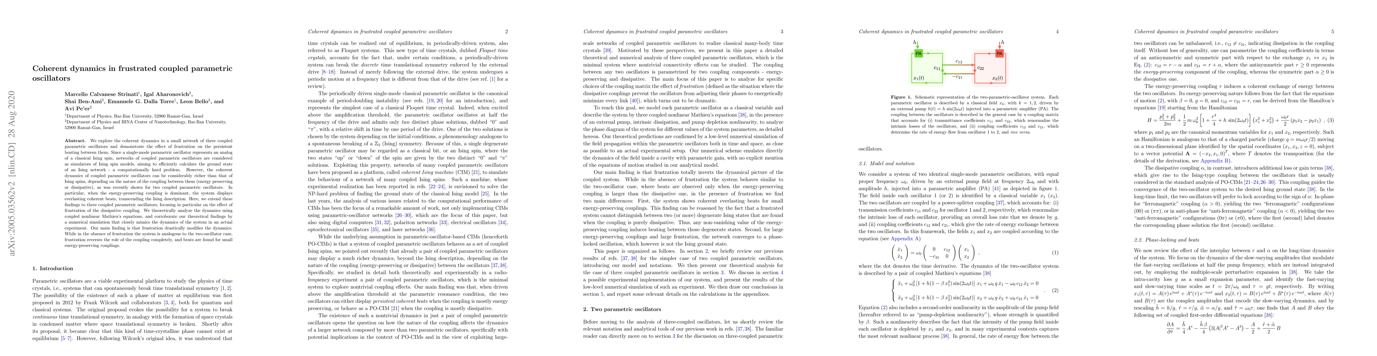 This paper investigates the coherent dynamics in a network of three coupled parametric oscillators, demonstrating how frustration affects persistent beating. The study reveals that frustration drastically alters the dynamics, reversing the role of coupling and leading to beats even with small energy-preserving couplings, thus extending previous findings on two-oscillator systems.