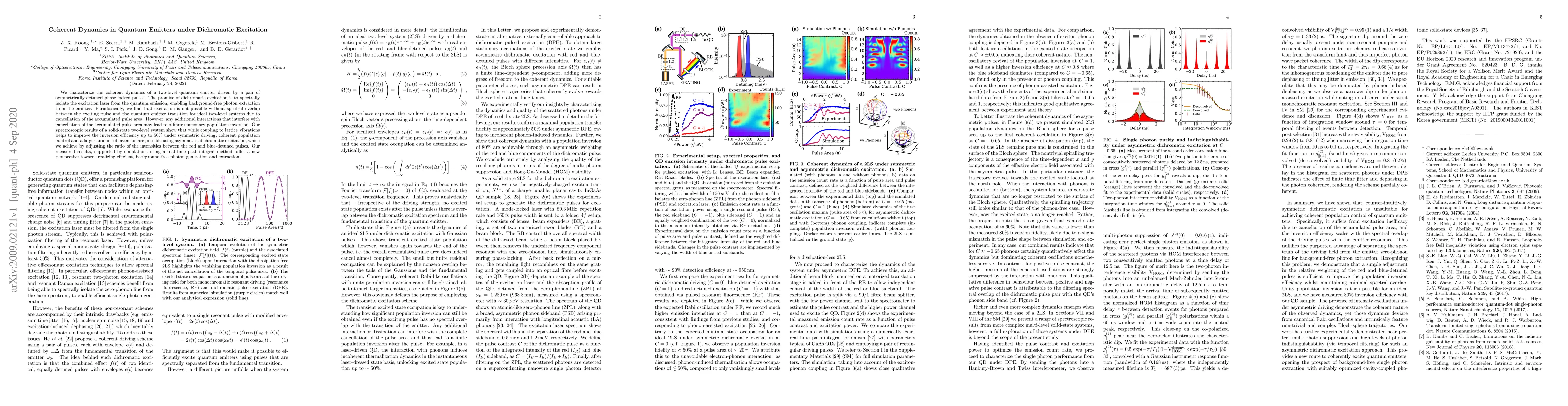 We characterize the coherent dynamics of a two-level quantum emitter driven by a pair of symmetrically-detuned phase-locked pulses. The promise of dichromatic excitation is to spectrally isolate the excitation laser from the quantum emission, enabling background-free photon extraction from the emitter. Paradoxically, we find that excitation is not possible without spectral overlap between the exciting pulse and the quantum emitter transition for ideal two-level systems due to cancellation of the accumulated pulse area. However, any additional interactions that interfere with cancellation of the accumulated pulse area may lead to a finite stationary population inversion. Our spectroscopic results of a solid-state two-level system show that while coupling to lattice vibrations helps to improve the inversion efficiency up to 50\% under symmetric driving, coherent population control and a larger amount of inversion are possible using asymmetric dichromatic excitation, which we achieve by adjusting the ratio of the intensities between the red and blue-detuned pulses. Our measured results, supported by simulations using a real-time path-integral method, offer a new perspective towards realising efficient, background-free photon generation and extraction.