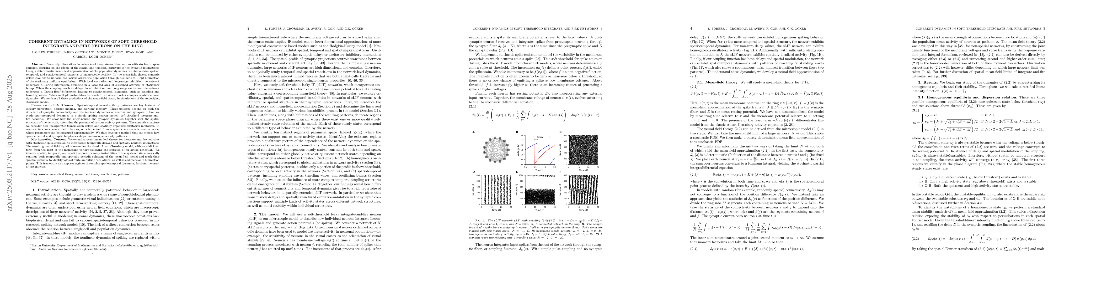 We study bifurcations in networks of integrate-and-fire neurons with stochastic spike emission, focusing on the effects of the spatial and temporal structure of the synaptic interactions. Using a deterministic mean-field approximation of the population dynamics, we characterize spatial, temporal, and spatiotemporal patterns of macroscopic activity. In the mean-field theory, synaptic delays give rise to uniform oscillations across the population through a subcritical Hopf bifurcation of the stationary uniform equilibrium. With local excitation and long-range inhibition the network undergoes a Turing bifurcation, resulting in a localized area of sustained activity, or stationary bump. When the coupling has both delays, local inhibition, and long range excitation, the network undergoes a Turing-Hopf bifurcation leading to spatiotemporal dynamics, such as standing and traveling waves. When multiple instabilities are excited, we observe other complex spatiotemporal dynamics. We confirm all these predictions of the mean-field theory in simulations of the underlying stochastic model.