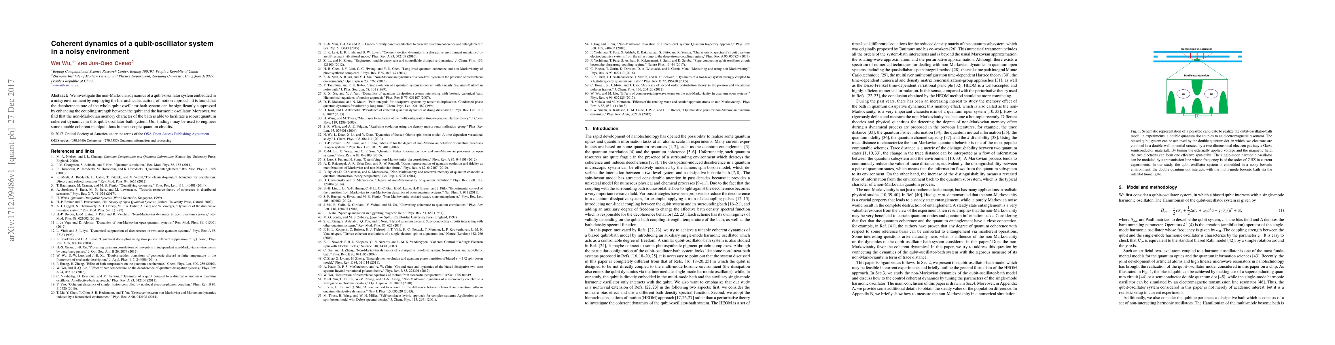 This paper explores the non-Markovian dynamics of a qubit-oscillator system in a noisy environment using hierarchical equations of motion, revealing that stronger qubit-oscillator coupling can significantly reduce decoherence. The study also shows that the bath's non-Markovian memory supports robust quantum coherence, potentially aiding tunable coherent manipulations in quantum circuits.
