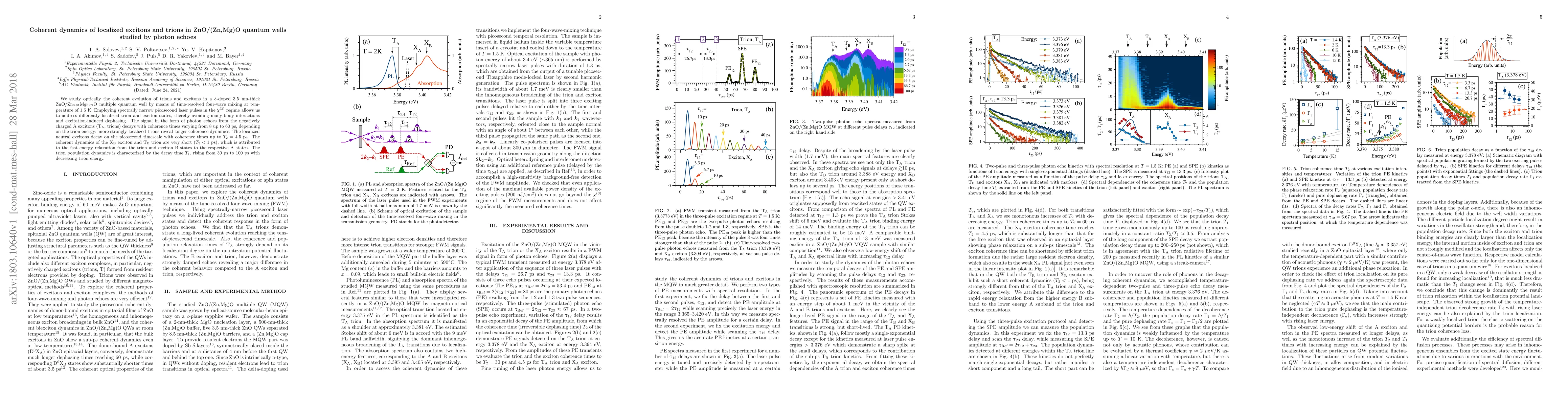 We study optically the coherent evolution of trions and excitons in a $\delta$-doped 3.5 nm-thick ZnO/Zn$_{0.91}$Mg$_{0.09}$O multiple quantum well by means of time-resolved four-wave mixing at temperature of 1.5~K. Employing spectrally narrow picosecond laser pulses in the $\chi^{(3)}$ regime allows us to address differently localized trion and exciton states, thereby avoiding many-body interactions and excitation-induced dephasing. The signal in the form of photon echoes from the negatively charged A excitons (T$_\text{A}$, trions) decays with coherence times varying from 8 up to 60~ps, depending on the trion energy: more strongly localized trions reveal longer coherence dynamics. The localized neutral excitons decay on the picosecond timescale with coherence times up to $T_2=4.5$~ps. The coherent dynamics of the X$_\text{B}$ exciton and T$_\text{B}$ trion are very short ($T_2<1$~ps), which is attributed to the fast energy relaxation from the trion and exciton B states to the respective A states. The trion population dynamics is characterized by the decay time $T_1$, rising from 30~ps to 100~ps with decreasing trion energy.