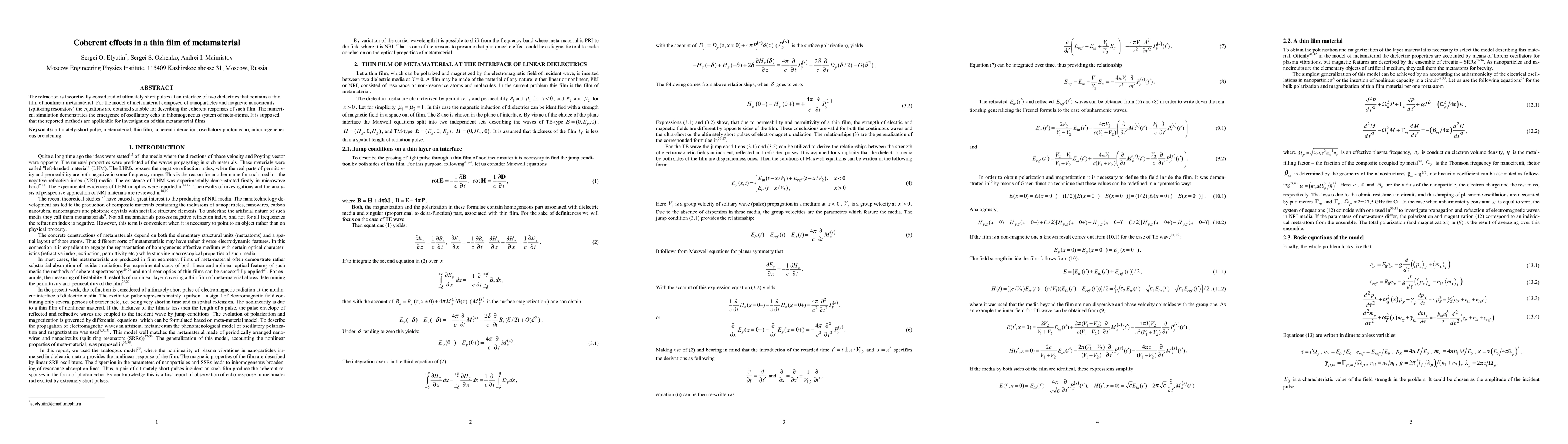 This paper investigates the coherent effects of ultra-short pulses refracting at the interface of two dielectrics containing a thin film of nonlinear metamaterial. It develops equations to describe the coherent responses of metamaterial films composed of nanoparticles and magnetic nanocircuits, revealing oscillatory echoes through numerical simulations.
