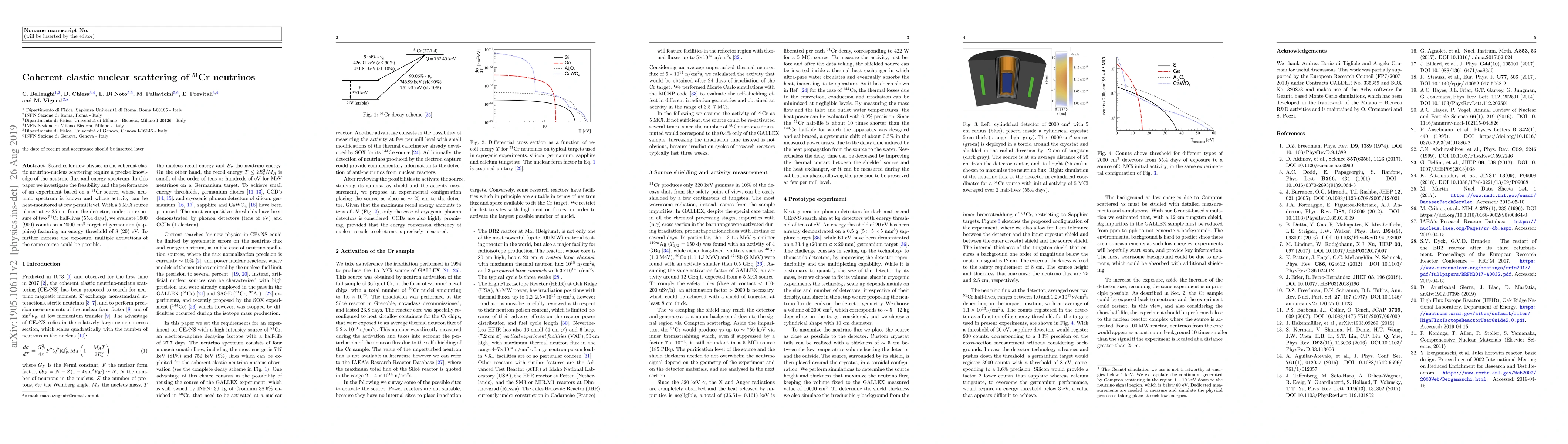 Searches for new physics in the coherent elastic neutrino-nucleus scattering require a precise knowledge of the neutrino flux and energy spectrum. In this paper we investigate the feasibility and the performances of an experiment based on a $^{51}$Cr source, whose neutrino spectrum is known and whose activity can be heat-monitored at few permil level. With a 5 MCi source placed at ~ 25 cm from the detector, under an exposure of two $^{51}$Cr half-lives (55.4 days), we evaluate 3900 (900) counts on a 2000 cm$^3$ target of germanium (sapphire) featuring an energy threshold of 8 (20) eV. To further increase the exposure, multiple activations of the same source could be possible.