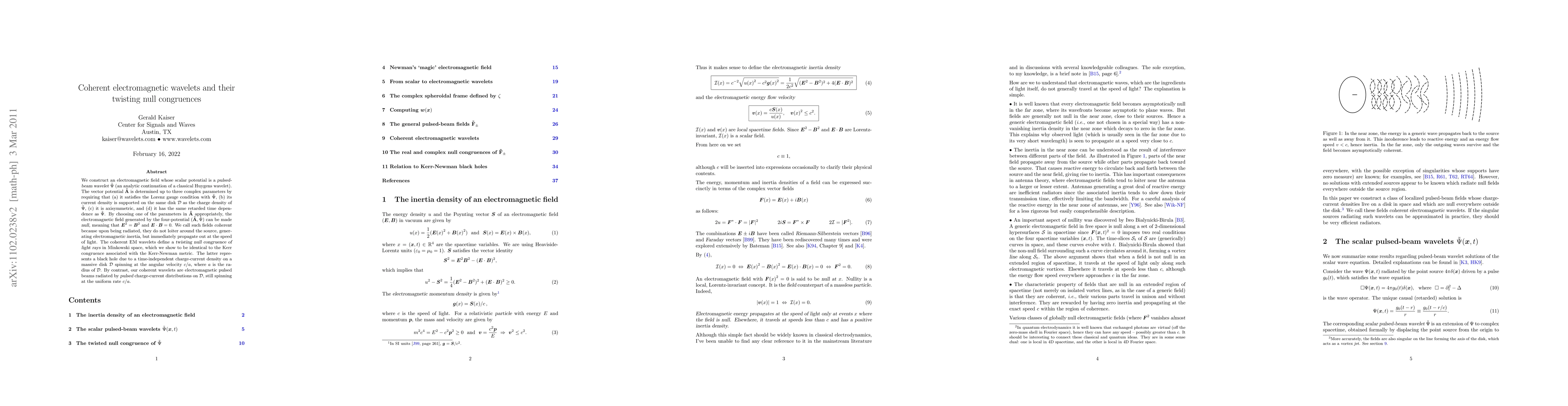 We construct an electromagnetic field whose scalar potential is a pulsed-beam wavelet Psi (an analytic continuation of a classical Huygens wavelet). The vector potential A is determined up to three complex parameters by requiring that (a) it satisfies the Lorenz gauge condition with Psi, (b) its current density is supported on the same disk D as the charge density of Psi, (c) it is axisymmetric, and (d) it has the same retarded time dependence as Psi. By choosing one of the parameters in A appropriately, the electromagnetic field generated by the four-potential (A, Psi) can be made null, meaning that E^2=B^2 and E dot B=0. We call such fields coherent because upon being radiated, they do not loiter around the source, generating electromagnetic inertia (a new concept related to reactive energy) but immediately propagate out at the speed of light. The coherent EM wavelets define a twisting null congruence of light rays in Minkowski space, which we show to be identical to the Kerr congruence associated with the Kerr-Newman metric. The latter represents a black hole due to a time-independent charge-current density on a massive disk D spinning at the angular velocity c/a, where a is the radius of D. By contrast, our coherent wavelets are electromagnetic pulsed beams radiated by pulsed charge-current distributions on D, still spinning at the uniform rate c/a.