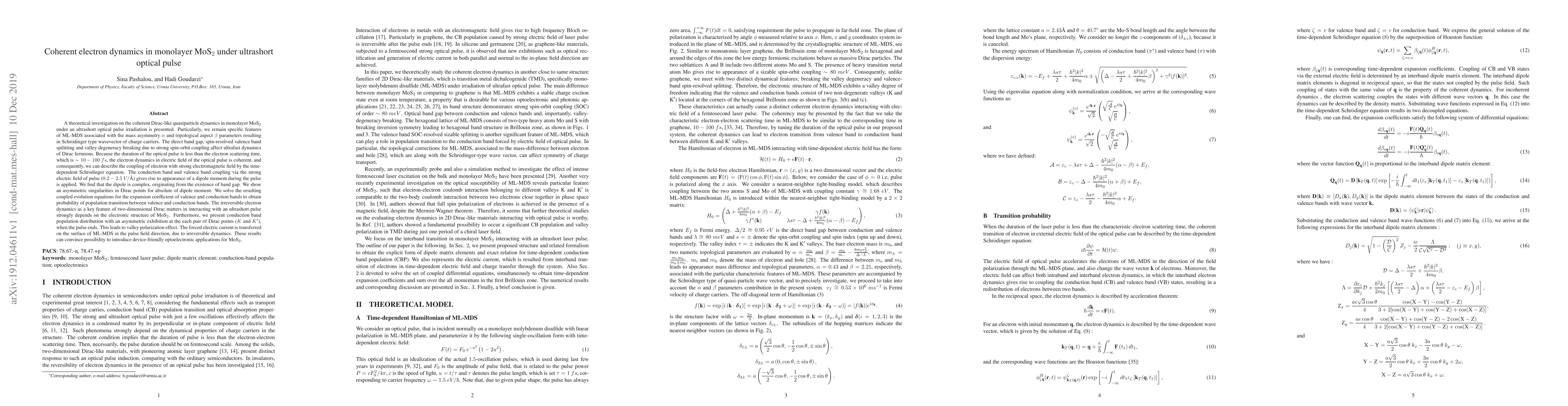 A theoretical investigation on the coherent Dirac-like quasiparticle dynamics in monolayer $\text{MoS}_2$ under an ultrashort optical pulse irradiation is presented. Particularly, we remain specific features of ML-MDS associated with the mass asymmetry $\alpha$ and topological aspect $\beta$ parameters resulting in Schr$\stackrel{..}{\text{o}}$dinger type wavevector of charge carriers. The direct band gap, spin-resolved valence band spilitting and valley degeneracy breaking due to strong spin-orbit coupling affect ultrafast dynamics of Dirac fermions. Because the duration of the optical pulse is less than the electron scattering time, which is $\sim 10-100\ fs$, the electron dynamics in electric field of the optical pulse is coherent, and consequently, we can describe the coupling of electron with strong electromagnetic field by the time-dependent Schr$\stackrel{..}{\text{o}}$dinger equation. The conduction band and valence band coupling via the strong electric field of pulse ($0.2-2.5 \ V/\text{\AA}$) gives rise to appearance of a dipole moment during the pulse is applied. We find that the dipole is complex, originating from the existence of band gap. We show an asymmetric singularities in Dirac points for absolute of dipole moment. We solve the resulting coupled evolution equations for the expansion coefficient of valence and conduction bands to obtain probability of population transition between valence and conduction bands. The irreversible electron dynamics as a key feature of two-dimensional Dirac matters in interacting with an ultrashort pulse strongly depends on the electronic structure of $\text{MoS}_2$. Furthermore, we present conduction band population distribution with an asymmetric exhibition at the each pair of Dirac points ($K$ and $K'$), when the pulse ends. This leads to valley polarization effect.