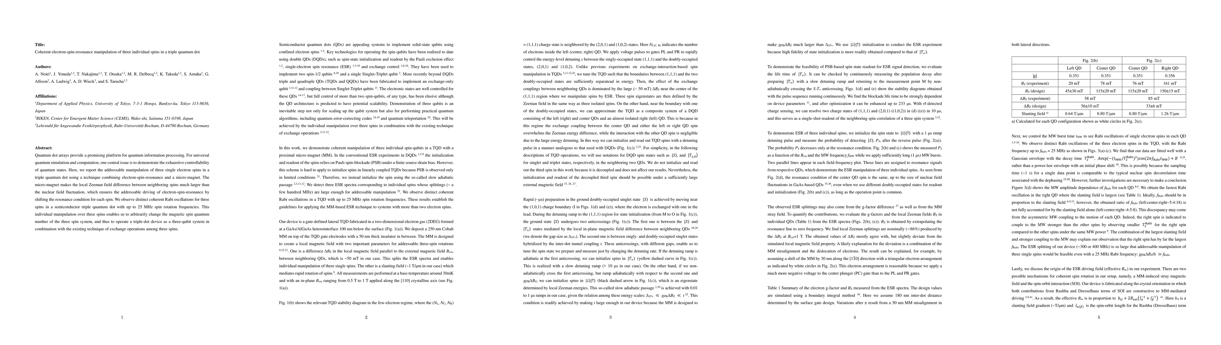 This paper demonstrates precise manipulation of three individual electron spins in a triple quantum dot using electron-spin-resonance and a micro-magnet, enabling coherent Rabi oscillations and potential for quantum information processing as a three-qubit system.