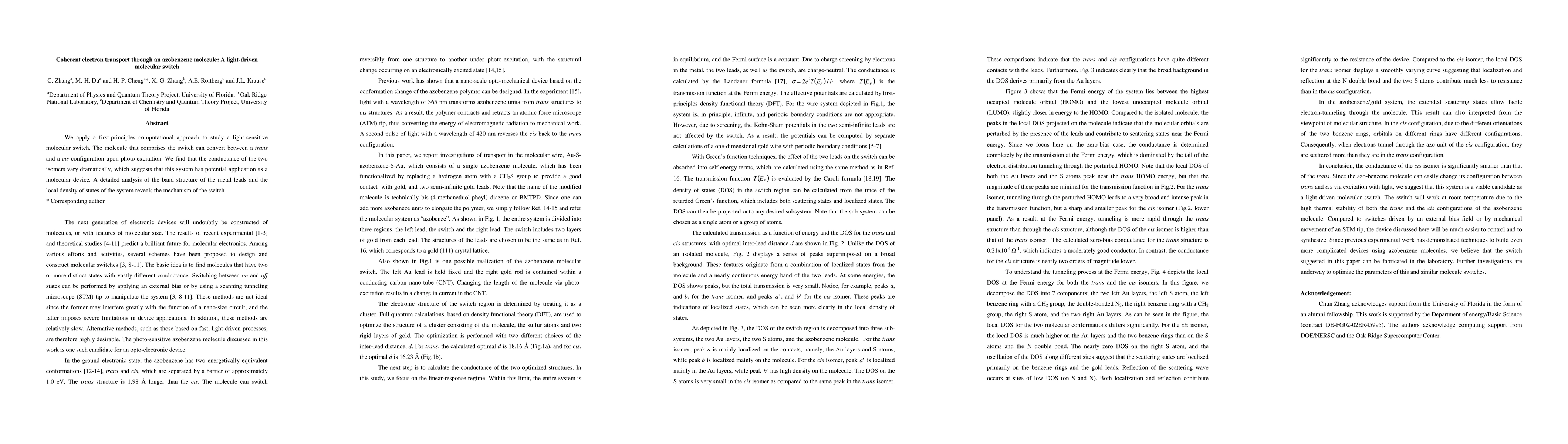 This study uses first-principles computational methods to investigate a light-sensitive azobenzene molecule that switches between trans and cis configurations upon photo-excitation. The research finds significant differences in conductance between the two isomers, indicating potential for use as a molecular device, with detailed analysis revealing the underlying mechanisms.