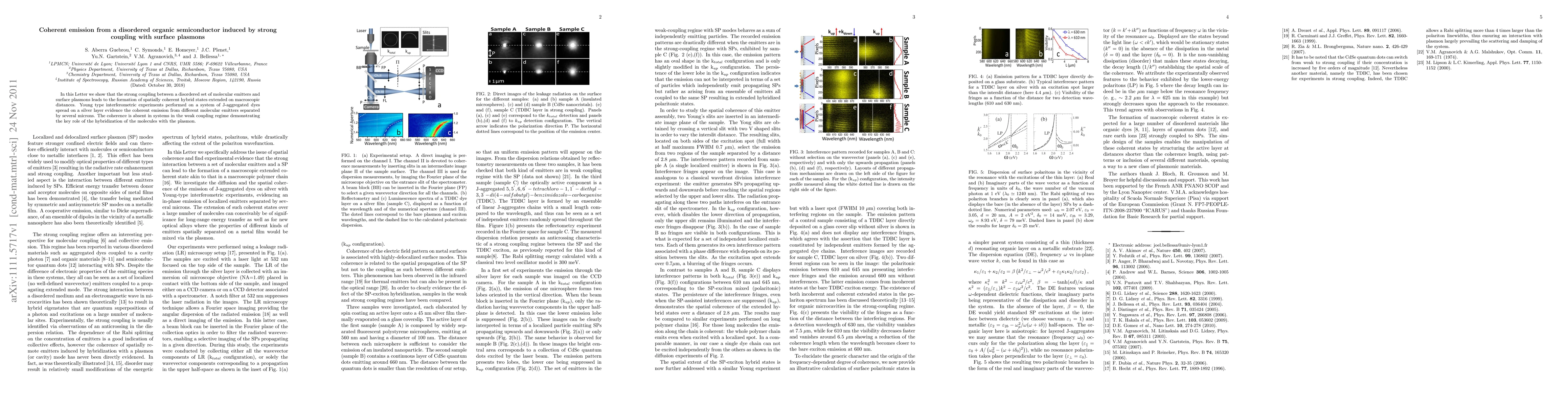 This paper demonstrates that strong coupling between disordered organic molecular emitters and surface plasmons generates spatially coherent hybrid states over macroscopic distances, evidenced by coherent emission in interferometric experiments, unlike in weak coupling regimes.