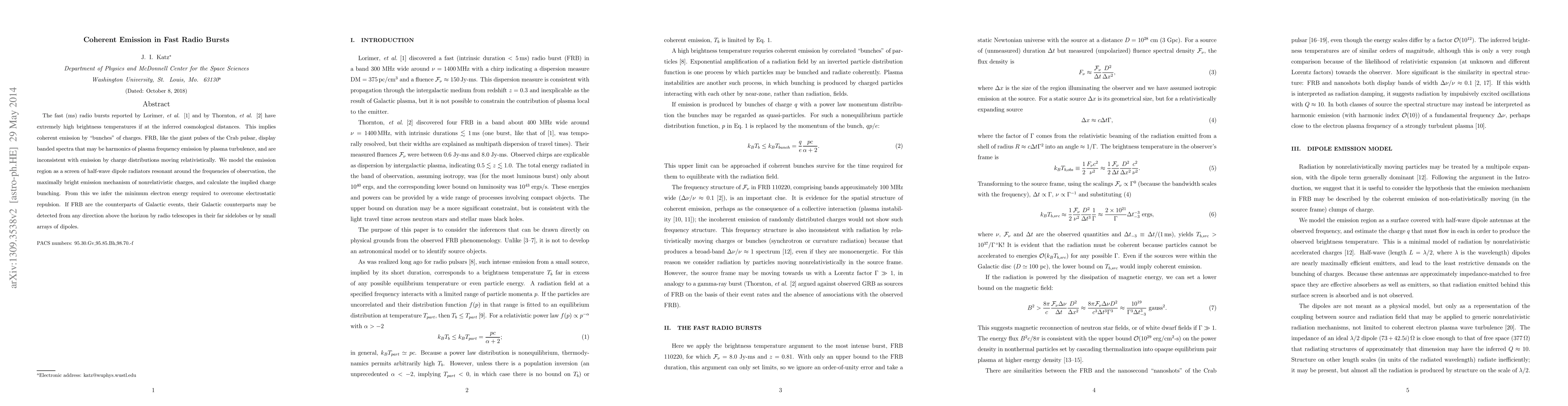 This paper explores the coherent emission mechanism behind fast radio bursts (FRBs), suggesting that their high brightness temperatures indicate emission from "bunches" of resonant dipole radiators. The study calculates the minimum electron energy required to overcome electrostatic repulsion, proposing that FRBs may be analogous to the Crab pulsar's giant pulses and detectable via radio telescopes.