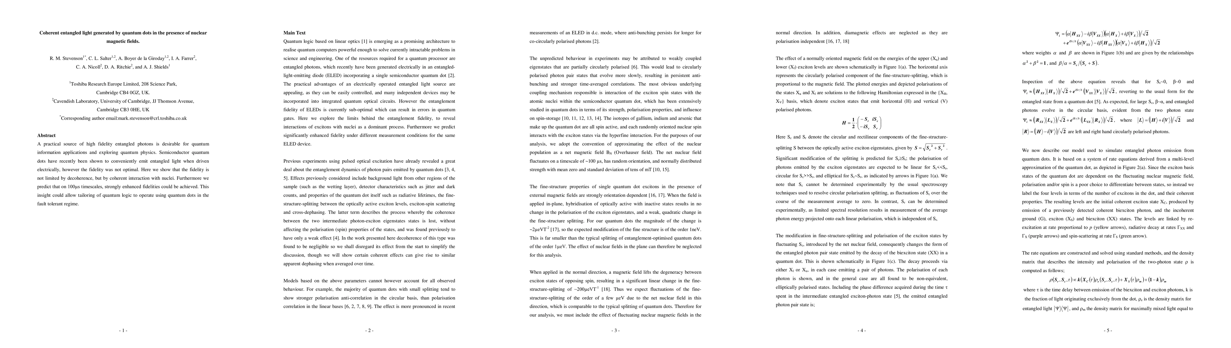 A practical source of high fidelity entangled photons is desirable for quantum information applications and exploring quantum physics. Semiconductor quantum dots have recently been shown to conveniently emit entangled light when driven electrically, however the fidelity was not optimal. Here we show that the fidelity is not limited by decoherence, but by coherent interaction with nuclei. Furthermore we predict that on 100\mu s timescales, strongly enhanced fidelities could be achieved. This insight could allow tailoring of quantum logic to operate using quantum dots in the fault tolerant regime.