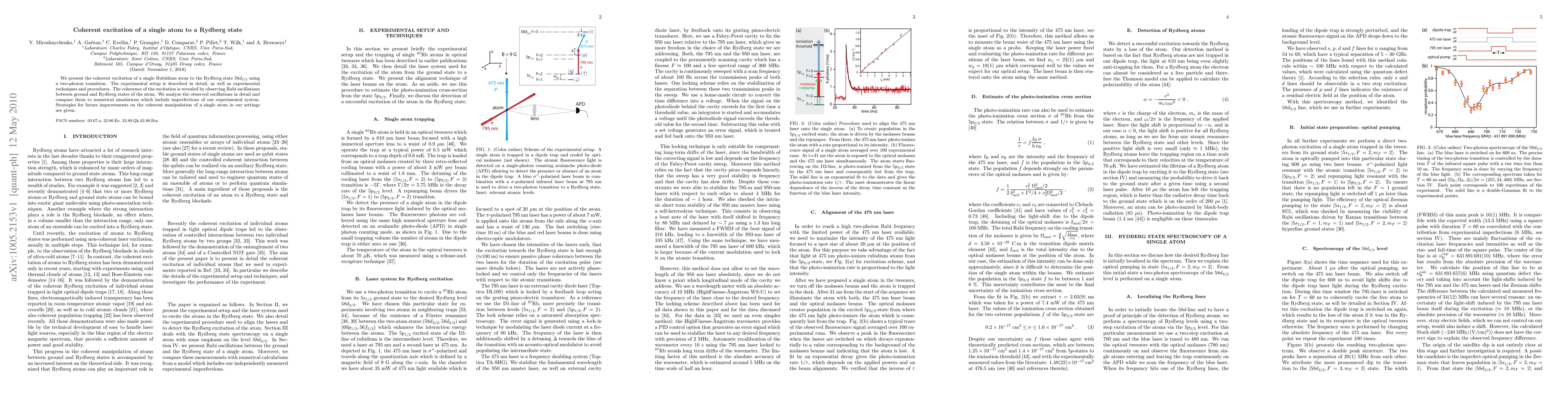 This paper details the coherent excitation of a single Rubidium atom to a Rydberg state via a two-photon transition, demonstrating coherence through observed Rabi oscillations and comparing experimental results with numerical simulations to identify areas for future improvements.