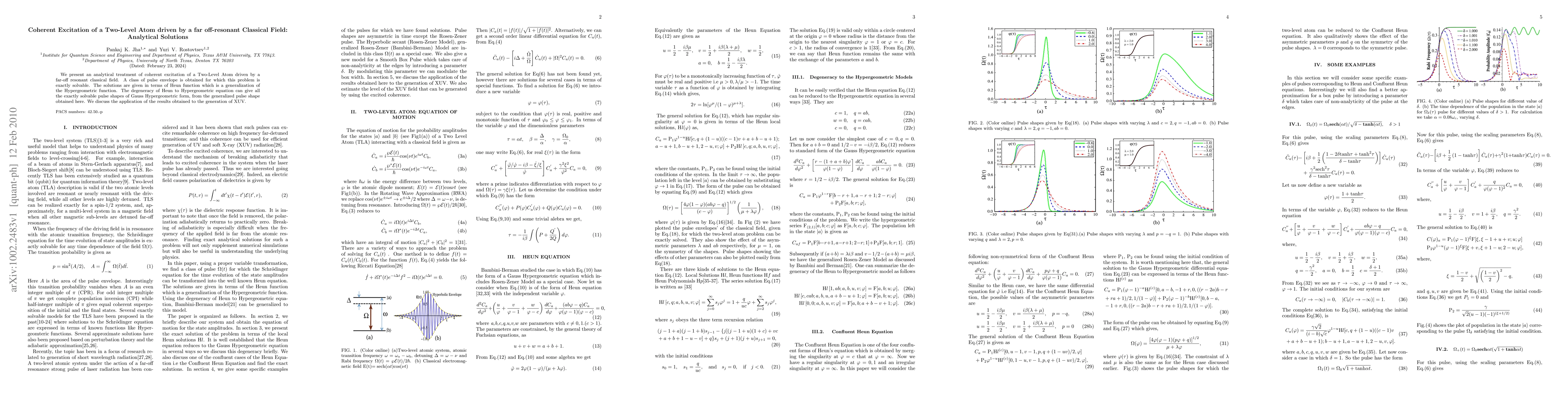 We present an analytical treatment of coherent excitation of a Two-Level Atom driven by a far-off resonant classical field. A class of pulse envelope is obtained for which this problem is exactly solvable. The solutions are given in terms of Heun function which is a generalization of the Hypergeometric function. The degeneracy of Heun to Hypergeometric equation can give all the exactly solvable pulse shapes of Gauss Hypergeometric form, from the generalized pulse shape obtained here. We discuss the application of the results obtained to the generation of XUV.