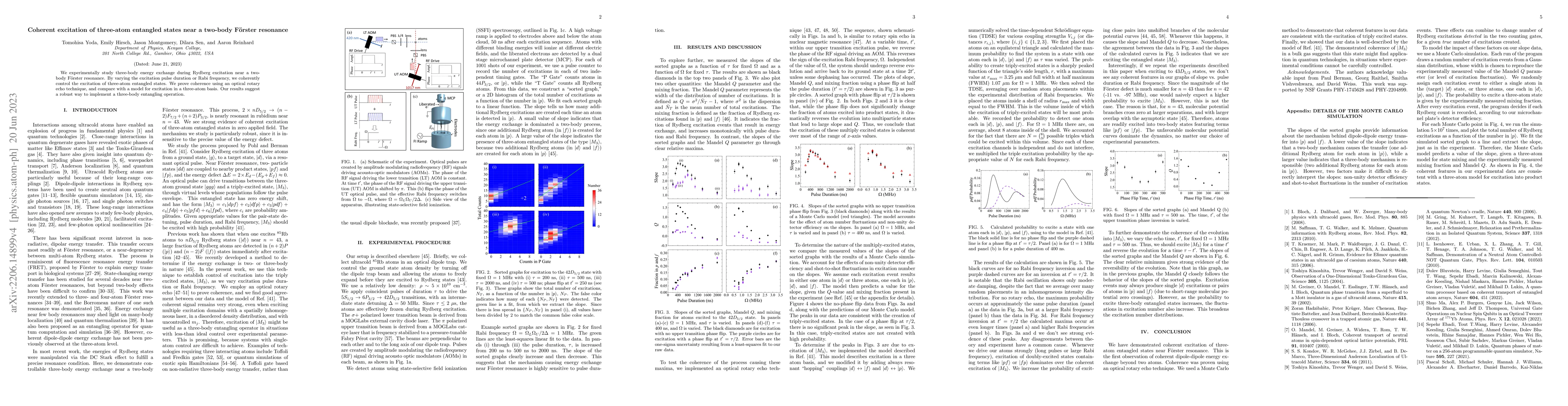 This paper investigates the coherent excitation of three-atom entangled states via Rydberg excitation near a two-body Förster resonance, demonstrating coherence through an optical rotary echo technique. The study proposes a robust method for implementing a three-body entangling operation by controlling the excitation process.