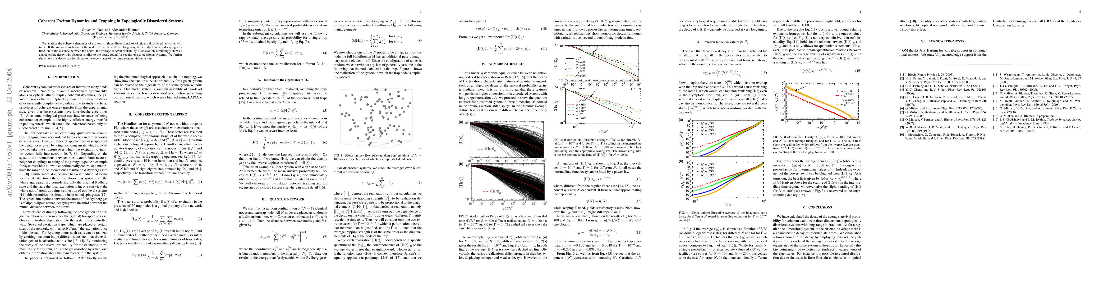 This paper investigates the coherent exciton dynamics in three-dimensional topologically disordered networks with traps, revealing that long-range interactions lead to exciton survival probabilities decaying similarly to one-dimensional systems. The study also connects this decay to the eigenstates of the system without traps.