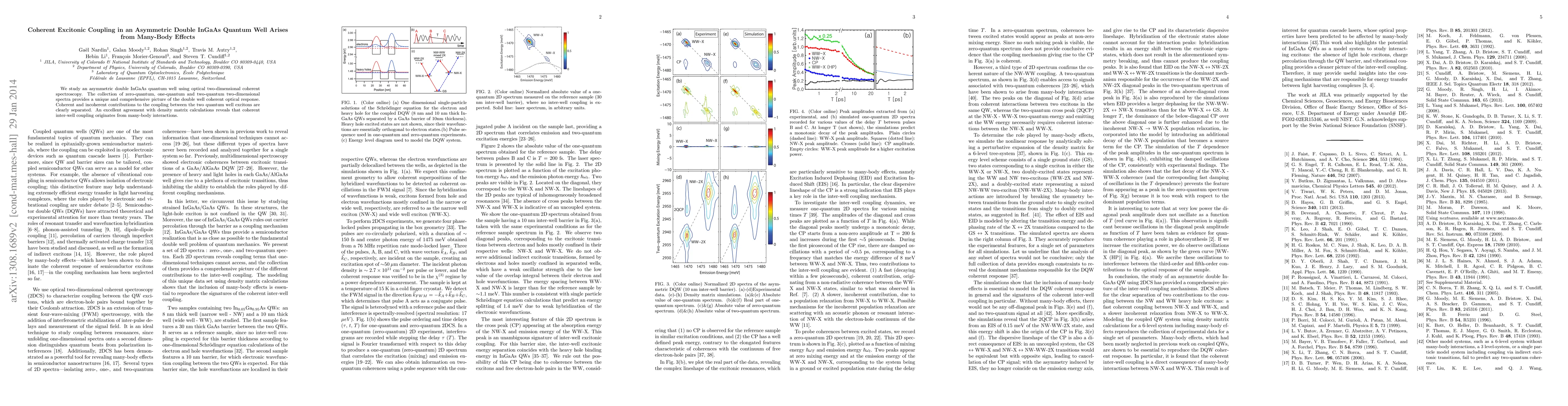 This study investigates an asymmetric double InGaAs quantum well using optical two-dimensional coherent spectroscopy, revealing that coherent excitonic coupling results from many-body effects, as demonstrated by agreement with density matrix calculations.