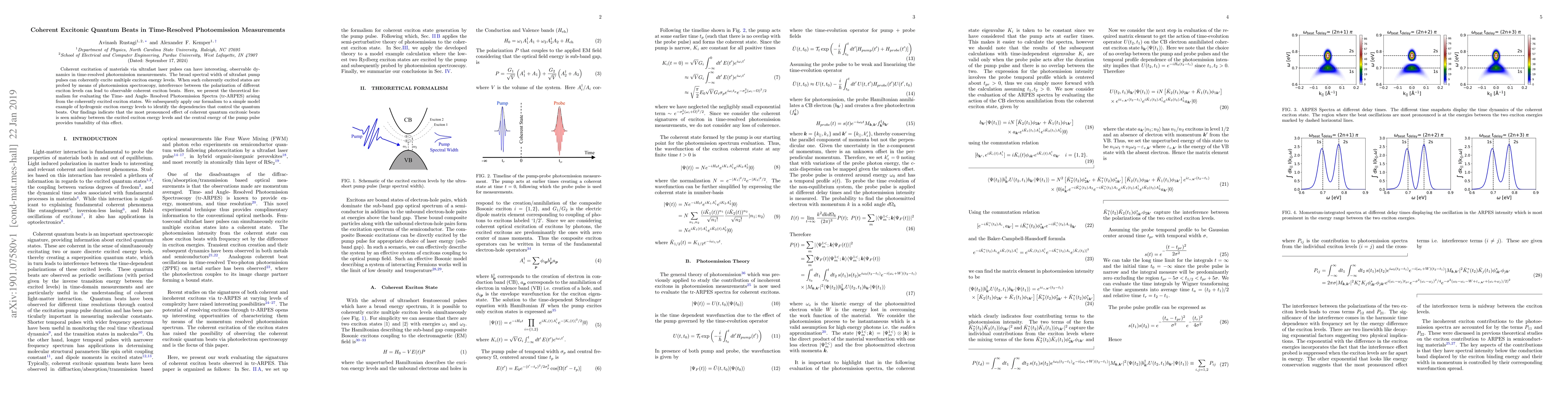 Coherent excitation of materials via ultrafast laser pulses can have interesting, observable dynamics in time-resolved photoemission measurements. The broad spectral width of ultrafast pump pulses can coherently excite multiple exciton energy levels. When such coherently excited states are probed by means of photoemission spectroscopy, interference between the polarization of different exciton levels can lead to observable coherent exciton beats. Here, we present the theoretical formalism for evaluating the Time- and Angle- Resolved Photoemission Spectra (tr-ARPES) arising from the coherently excited exciton states. We subsequently apply our formalism to a simple model example of hydrogenic exciton energy levels to identify the dependencies that control the quantum beats. Our findings indicate that the most pronounced effect of coherent quantum excitonic beats is seen midway between the excited exciton energy levels and the central energy of the pump pulse provides tunability of this effect.