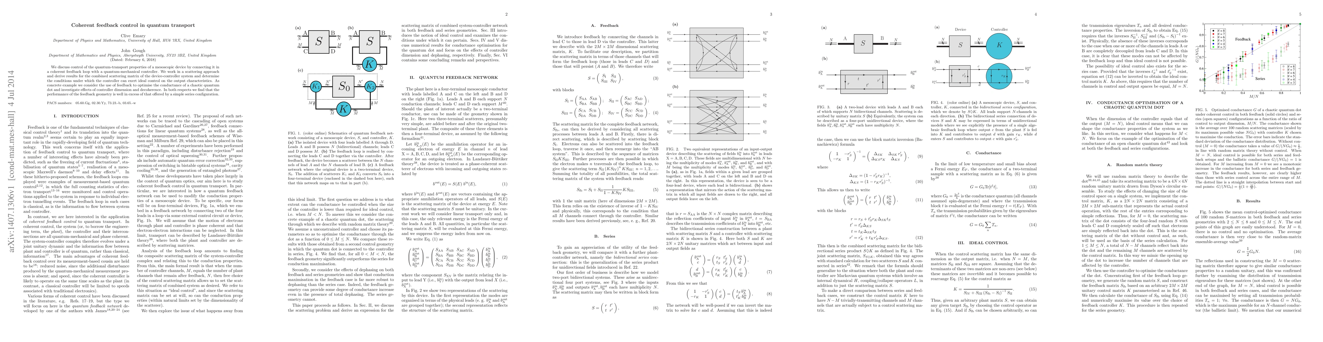 This paper explores coherent feedback control in quantum transport, demonstrating how a quantum-mechanical controller can optimize a mesoscopic device's conductance through a coherent feedback loop. The study finds that this feedback geometry significantly outperforms a simple series configuration, especially regarding controller dimension and decoherence effects.