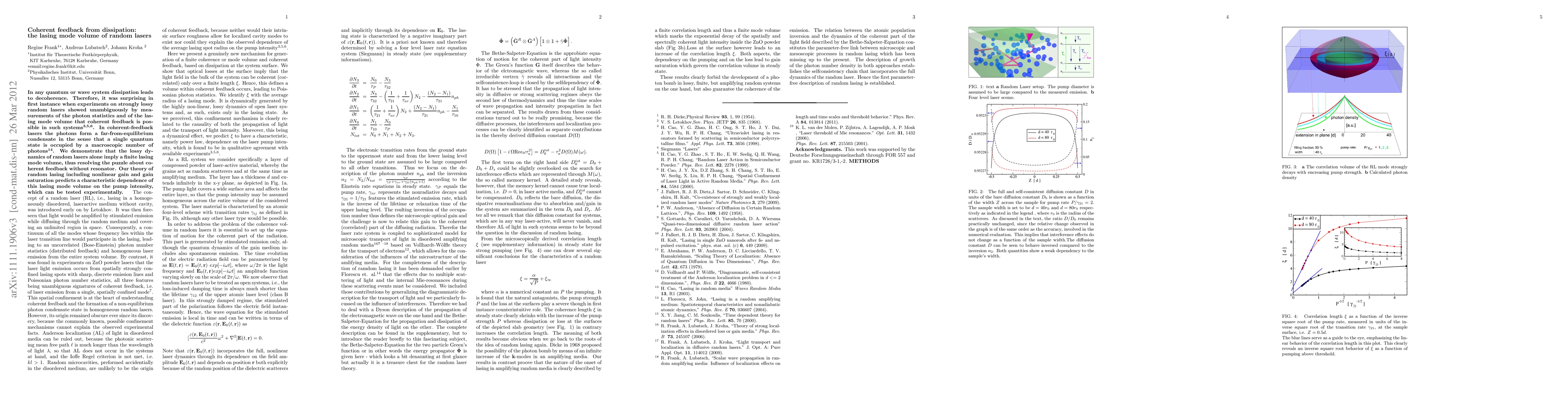 In any quantum or wave system dissipation leads to decoherence. Therefore, it was surprising in first instance when experiments on strongly lossy random lasers showed unambiguously by measurements of the photon statistics and of the lasing mode volume that coherent feedback is possible in such systems3-5,8. In coherent-feedback lasers the photons form a far-from-equilibrium condensate in the sense that a single quantum state is occupied by a macroscopic number of photons15. We demonstrate that the lossy dynamics of random lasers alone imply a three dimensional finite lasing mode extent, thus resolving the puzzle about coherent feedback without resonator. Our theory of random lasing including nonlinear gain and gain saturation predicts a characteristic dependence of this lasing mode volume on the pump intensity, which can be tested experimentally.
