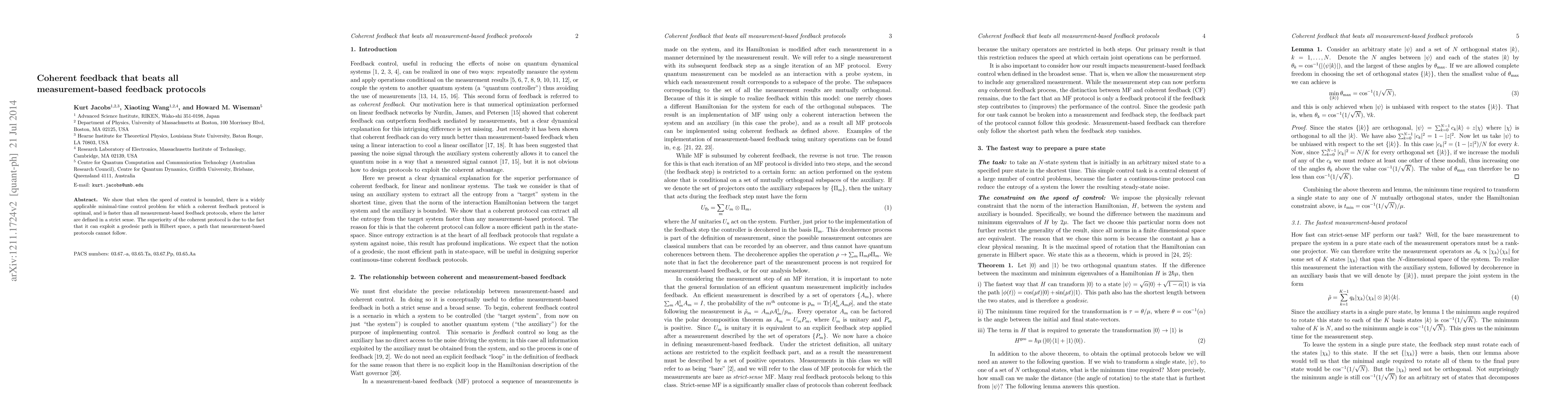 This paper demonstrates that a coherent feedback protocol outperforms all measurement-based feedback protocols in minimal-time control when control speed is limited. The coherent protocol's advantage stems from its ability to follow a geodesic path in Hilbert space, which measurement-based protocols cannot utilize.