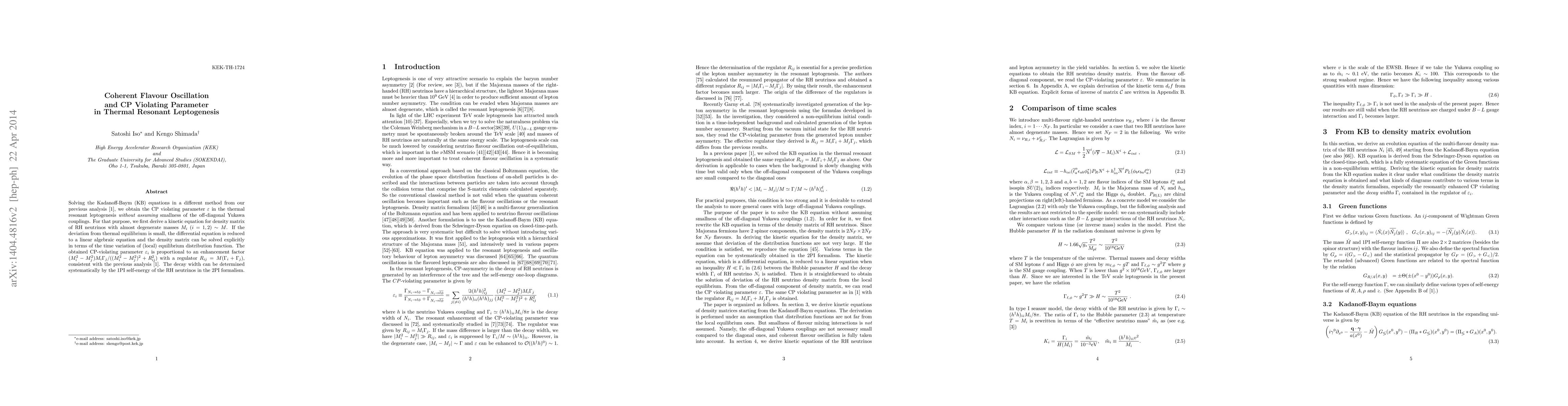 This paper solves the Kadanoff-Baym equations to derive a kinetic equation for the density matrix of nearly degenerate right-handed neutrinos, obtaining a CP-violating parameter $\varepsilon$ in thermal resonant leptogenesis without assuming small off-diagonal Yukawa couplings. The CP-violating parameter $\varepsilon_i$ is proportional to an enhancement factor involving mass and decay width differences.
