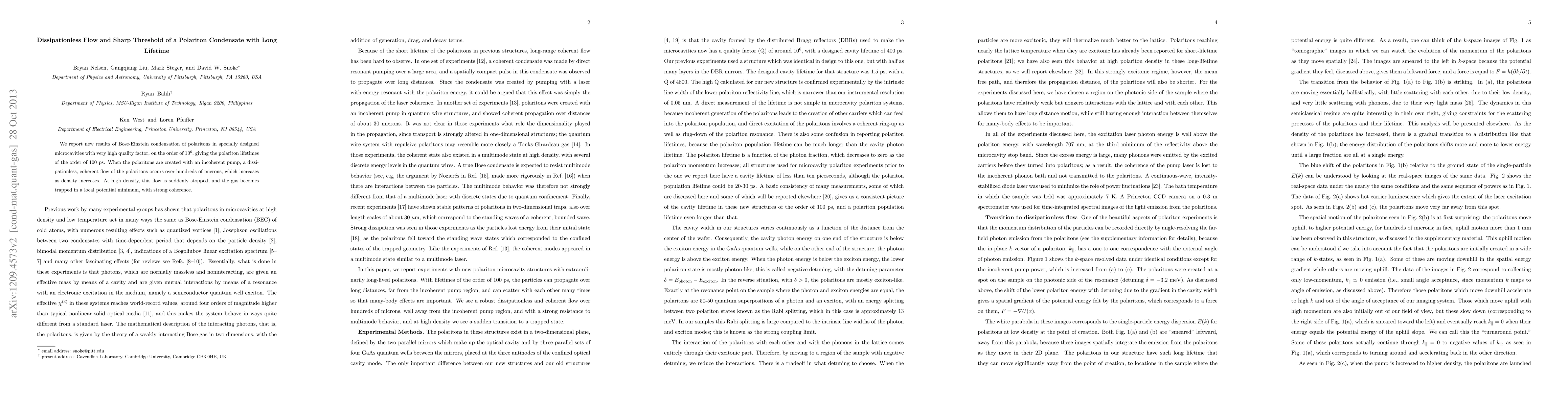 We report new results of Bose-Einstein condensation of polaritons in specially designed microcavities with very high quality factor, on the order of $10^6$, giving the polariton lifetimes of the order of 100 ps. When the polaritons are created with an incoherent pump, a dissipationless, coherent flow of the polaritons occurs over hundreds of microns, which increases as density increases. At high density, this flow is suddenly stopped, and the gas becomes trapped in a local potential minimum, with strong coherence.