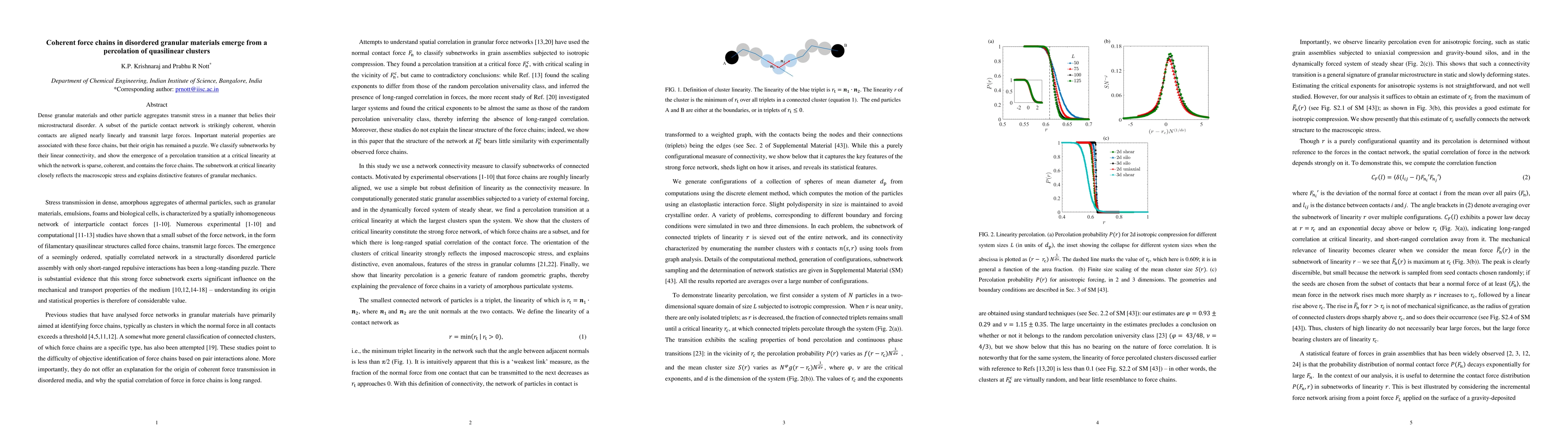 This paper explores how dense granular materials develop coherent force chains despite their disordered microstructure, revealing a percolation transition at a critical linearity where the network becomes sparse and coherent, closely reflecting macroscopic stress and explaining unique granular mechanics.