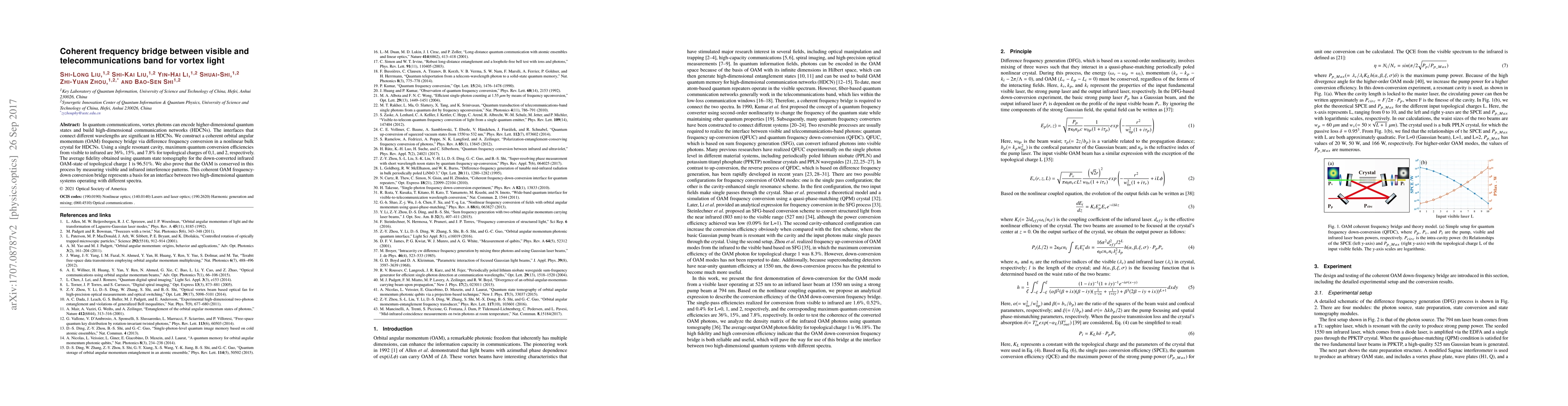 This paper presents a method for constructing a coherent frequency bridge between visible and telecommunications bands using vortex light, achieving high quantum conversion efficiencies and fidelity for different topological charges. The OAM conservation is demonstrated, establishing a foundation for interfacing high-dimensional quantum communication networks operating at different spectra.