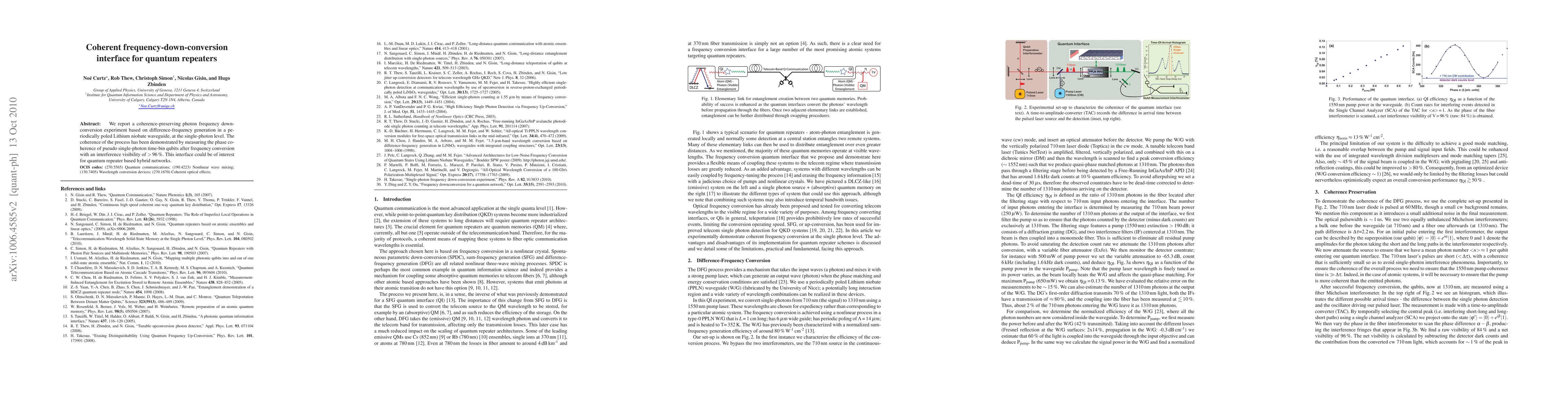Researchers have successfully demonstrated a coherence-preserving photon frequency down-conversion process in a Lithium niobate waveguide, enabling the creation of high-quality quantum repeater interfaces with an interference visibility of >96%.