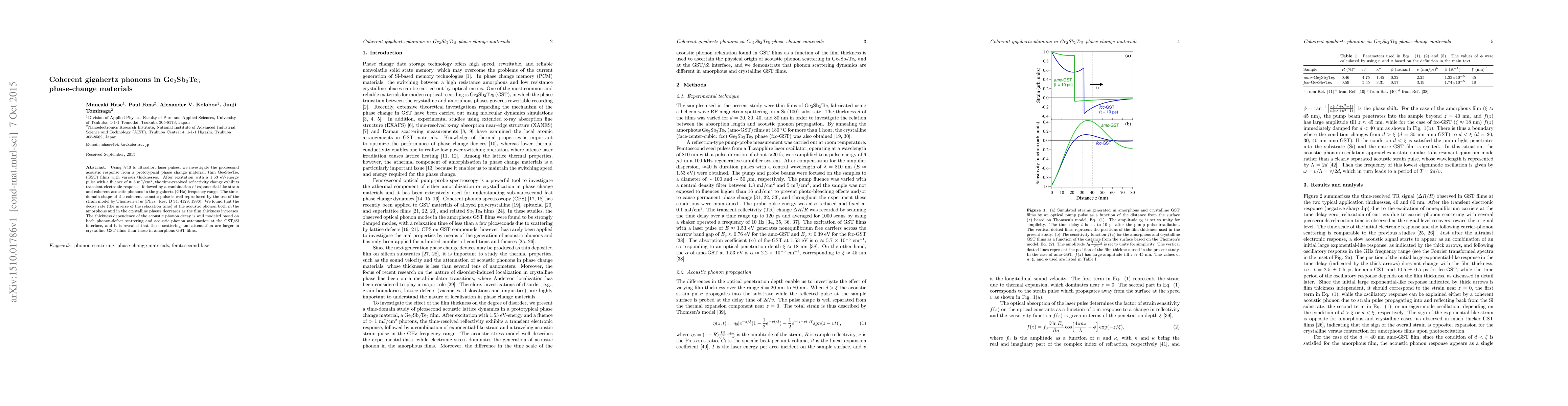 Using $\approx$40 fs ultrashort laser pulses, we investigate the picosecond acoustic response from a prototypical phase change material, thin Ge$_{2}$Sb$_{2}$Te$_{5}$ (GST) films with various thicknesses. After excitation with a 1.53 eV-energy pulse with a fluence of $\approx$ 5 mJ/cm$^{2}$, the time-resolved reflectivity change exhibits transient electronic response, followed by a combination of exponential-like strain and coherent acoustic phonons in the gigahertz (GHz) frequency range. The time-domain shape of the coherent acoustic pulse is well reproduced by the use of the strain model by Thomsen et al. (Phys. Rev. B 34, 4129, 1986). We found that the decay rate (the inverse of the relaxation time) of the acoustic phonon both in the amorphous and in the crystalline phases decreases as the film thickness increases. The thickness dependence of the acoustic phonon decay is well modeled based on both phonon-defect scattering and acoustic phonon attenuation at the GST/Si interface, and it is revealed that those scattering and attenuation are larger in crystalline GST films than those in amorphous GST films.