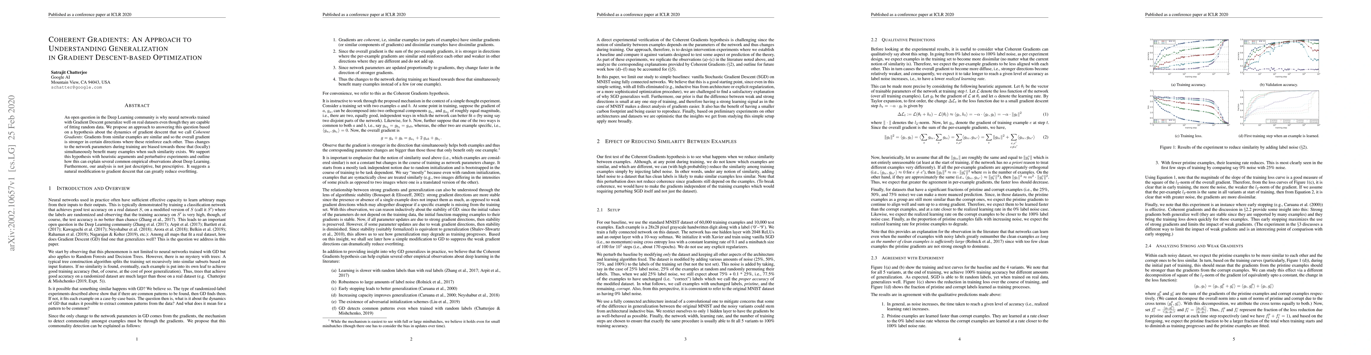 An open question in the Deep Learning community is why neural networks trained with Gradient Descent generalize well on real datasets even though they are capable of fitting random data. We propose an approach to answering this question based on a hypothesis about the dynamics of gradient descent that we call Coherent Gradients: Gradients from similar examples are similar and so the overall gradient is stronger in certain directions where these reinforce each other. Thus changes to the network parameters during training are biased towards those that (locally) simultaneously benefit many examples when such similarity exists. We support this hypothesis with heuristic arguments and perturbative experiments and outline how this can explain several common empirical observations about Deep Learning. Furthermore, our analysis is not just descriptive, but prescriptive. It suggests a natural modification to gradient descent that can greatly reduce overfitting.