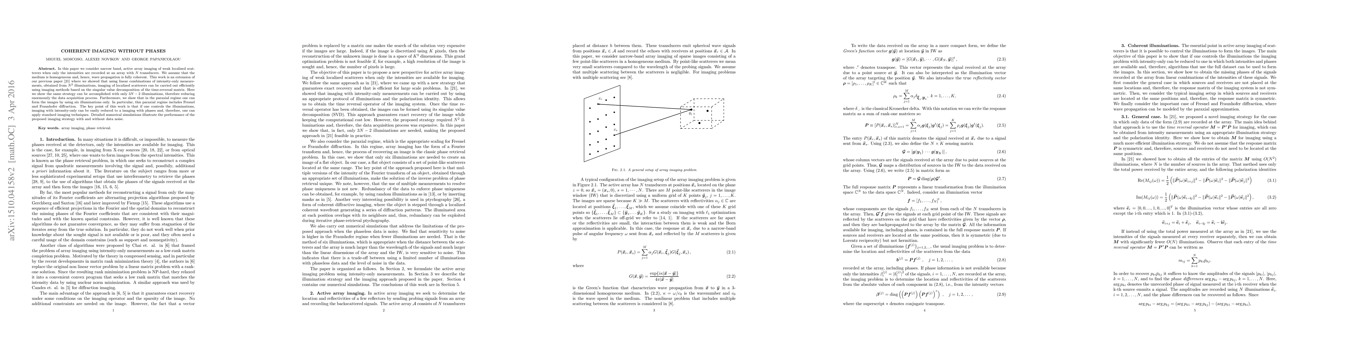 In this paper we consider narrow band, active array imaging of weak localized scatterers when only the intensities are recorded at an array with N transducers. We consider that the medium is homogeneous and, hence, wave propagation is fully coherent. This work is an extension of our previous paper, where we showed that using linear combinations of intensity-only measurements imaging of localized scatterers can be carried out efficiently using MUSIC or sparsity promoting optimization. Here we show the same strategy can be accomplished with only 3N-2 illuminations, therefore reducing enormously the data acquisition process. Furthermore, we show that in the paraxial regime one can form the images by using six illuminations only. In particular, this paraxial regime includes Fresnel and Fraunhofer diffraction. The key point of this work is that if one controls the illuminations, imaging with intensity-only can be easily reduced to a imaging with phases and, therefore, one can apply standard imaging techniques. Detailed numerical simulations illustrate the performance of the proposed imaging strategy with and without data noise.