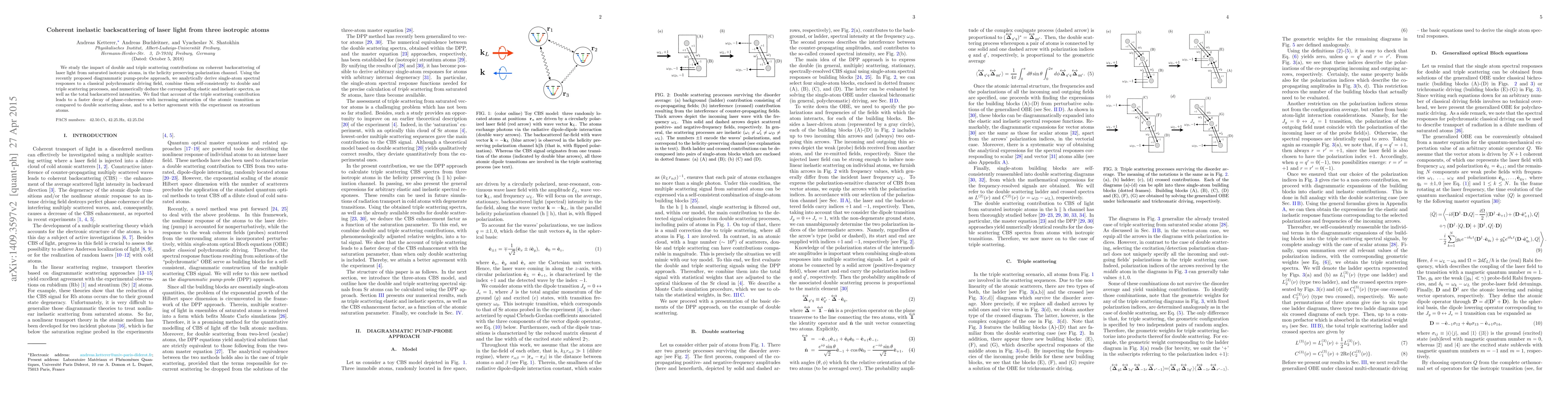 This paper investigates the coherent inelastic backscattering of laser light from three isotropic atoms, focusing on the contributions of double and triple scattering. The authors use a diagrammatic pump-probe approach to derive spectral responses and numerically deduce elastic and inelastic spectra, finding that triple scattering enhances the decay of phase-coherence and better aligns with experimental observations on strontium atoms.