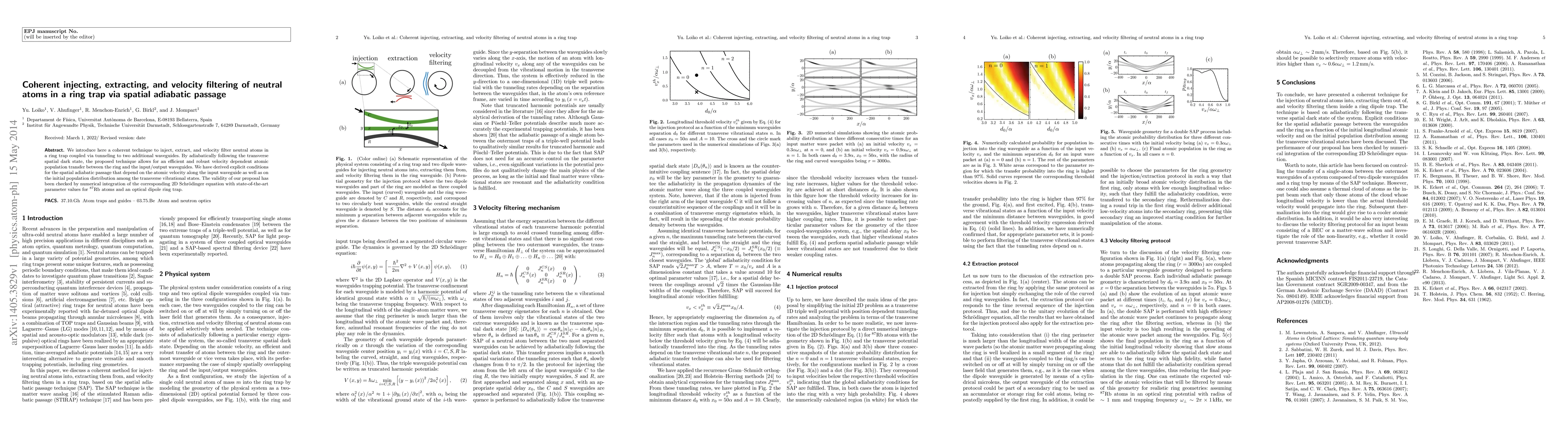 This paper proposes a coherent technique for injecting, extracting, and velocity filtering neutral atoms in a ring trap using spatial adiabatic passage. The method efficiently transfers atomic populations based on velocity, validated through numerical simulations for $^{87}$Rb atoms.
