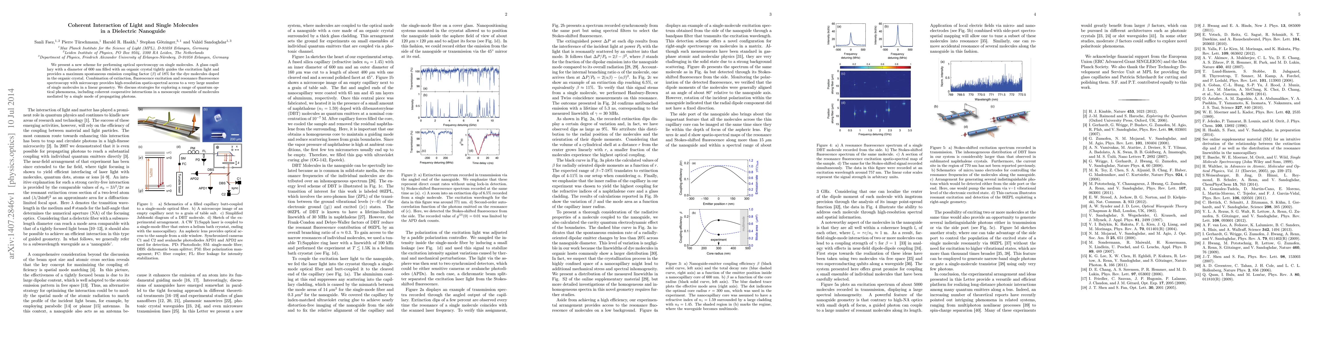 This paper introduces a novel optical spectroscopy method using a 600 nm glass capillary filled with an organic crystal to guide excitation light and enhance spontaneous emission coupling for single dye molecules, achieving a coupling factor of 18%. The study combines multiple spectroscopic techniques to achieve high-resolution analysis of numerous single molecules, and explores potential quantum optical phenomena.