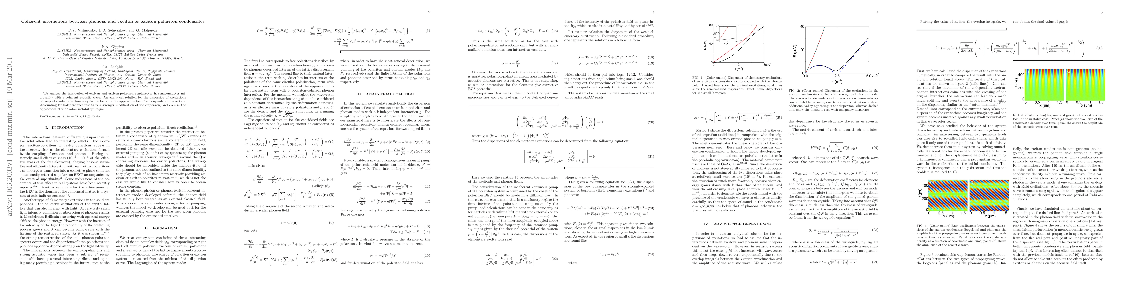 This paper investigates the coherent interactions between phonons and exciton or exciton-polariton condensates in semiconductor microcavities, revealing an analytical solution for coupled condensate-phonon system excitations and noting the emergence of a "roton instability" region when k-dependence is considered.