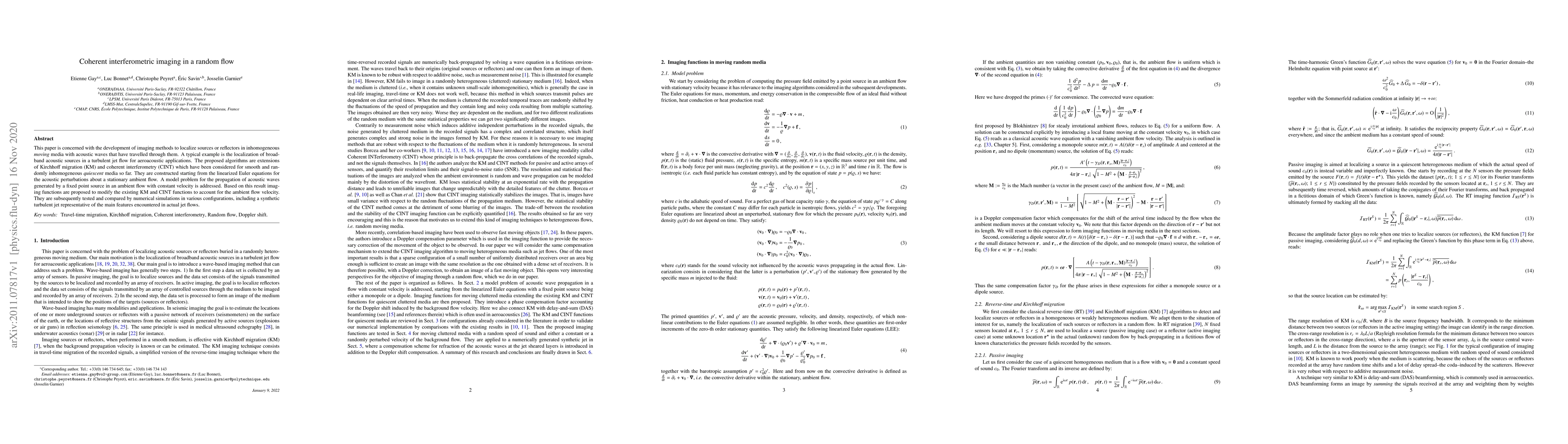 This paper is concerned with the development of imaging methods to localize sources or reflectors in inhomogeneous moving media with acoustic waves that have travelled through them. A typical example is the localization of broadband acoustic sources in a turbulent jet flow for aeroacoustic applications. The proposed algorithms are extensions of Kirchhoff migration (KM) and coherent interferometry (CINT) which have been considered for smooth and randomly inhomogeneous quiescent media so far. They are constructed starting from the linearized Euler equations for the acoustic perturbations about a stationary ambient flow. A model problem for the propagation of acoustic waves generated by a fixed point source in an ambient flow with constant velocity is addressed. Based on this result imaging functions are proposed to modify the existing KM and CINT functions to account for the ambient flow velocity. They are subsequently tested and compared by numerical simulations in various configurations, including a synthetic turbulent jet representative of the main features encountered in actual jet flows.