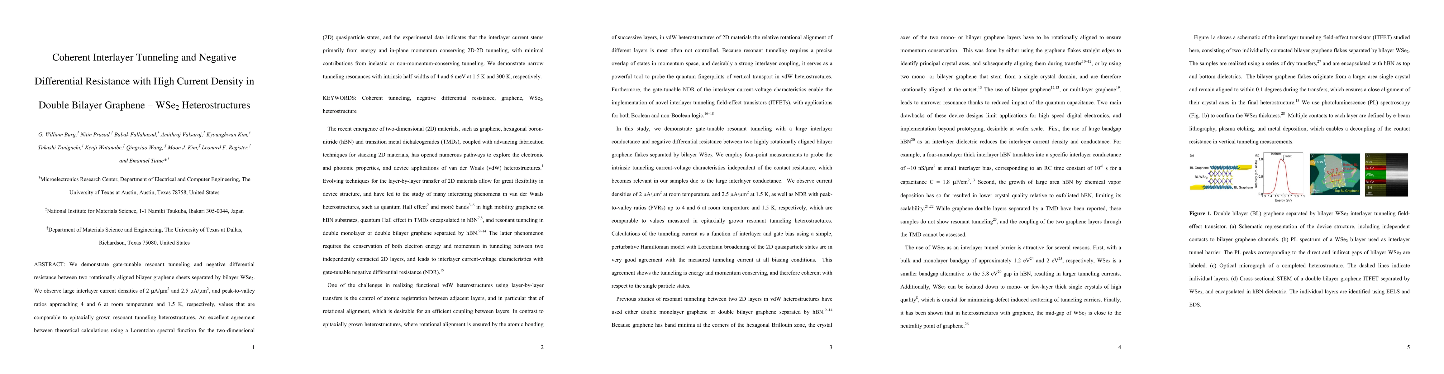 This paper demonstrates gate-tunable resonant tunneling and negative differential resistance in double bilayer graphene-WSe2 heterostructures, achieving high current densities and peak-to-valley ratios comparable to epitaxially grown structures. Theoretical models align well with experimental data, indicating dominant 2D-2D tunneling with minimal inelastic contributions.
