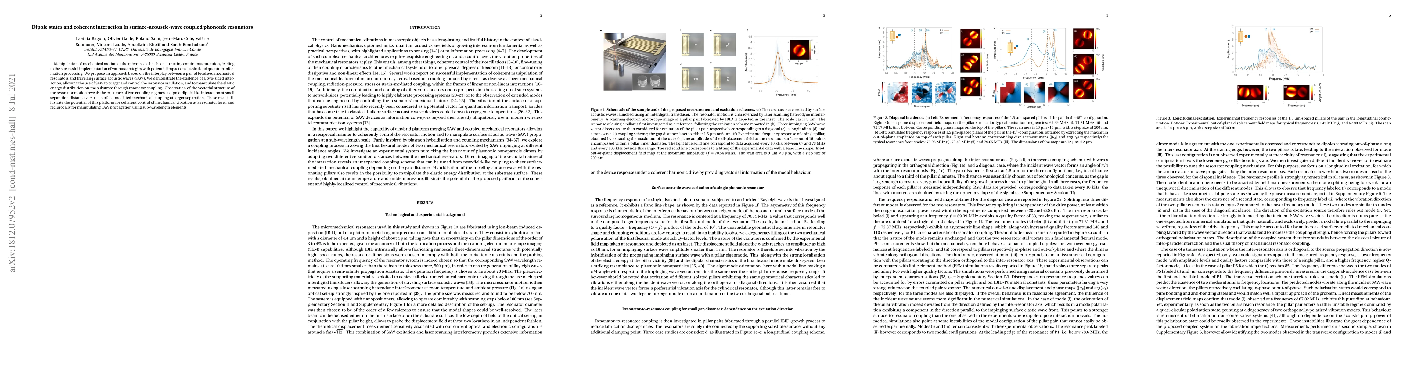 Manipulation of mechanical motion at the micro-scale has been attracting continuous attention, leading to the successful implementation of various strategies with potential impact on classical and quantum information processing. We here propose an approach based on the interplay between a pair of localized mechanical resonators and travelling surface acoustic waves (SAW). We demonstrate the existence of a two-sided interaction, allowing to use SAW to trigger and control the resonator oscillation, and to manipulate the elastic energy distribution on the substrate through resonator coupling. Observation of the vectorial structure of the resonator motion reveals the existence of two coupling regimes, a dipole-dipole-like interaction at small separation distance versus a surface-mediated mechanical coupling at larger separation. These results illustrate the potential of this platform for coherent control of mechanical vibration at a resonator level, and reciprocally for manipulating SAW propagation using sub-wavelength elements.